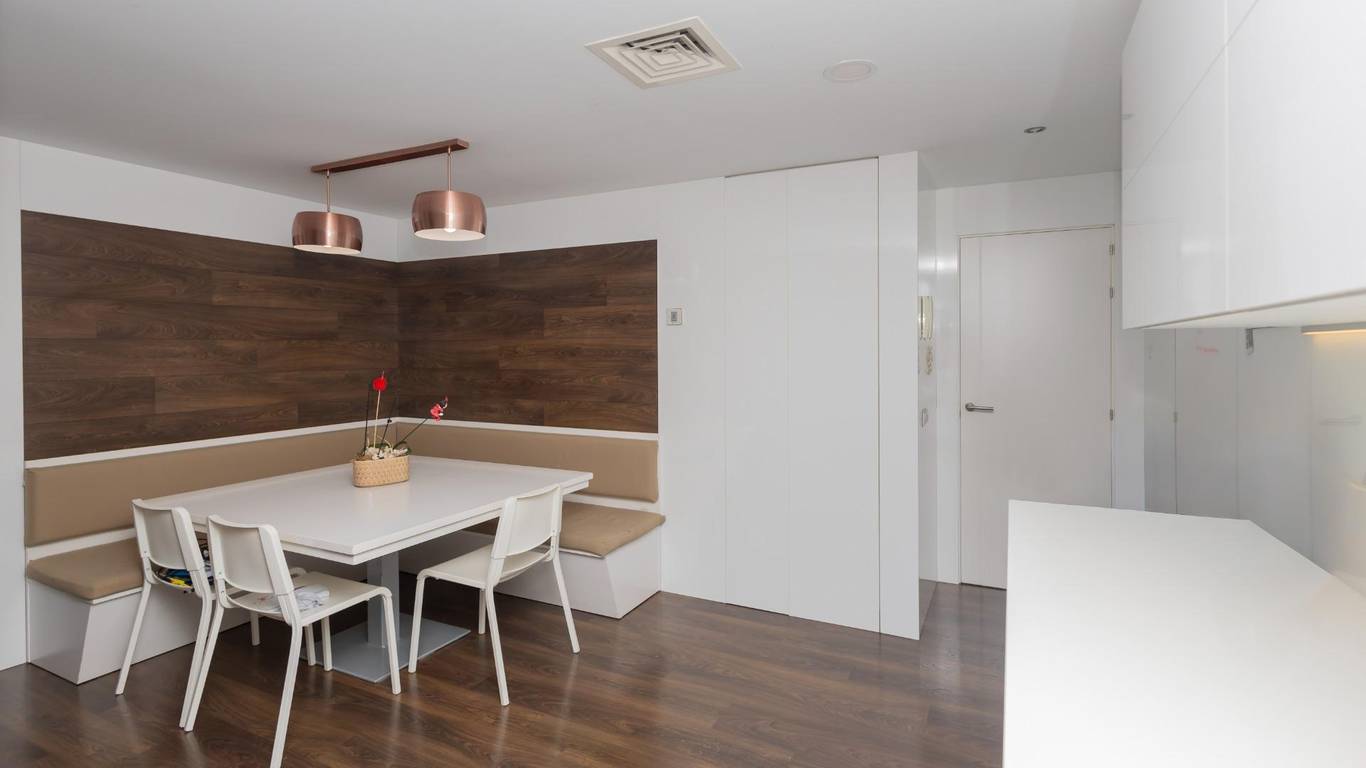 La luminosidad, junto con el suelo de tarima, aporta una agradable calidez y continuidad visual. El comedor, separado del salón, invita a reuniones familiares y cenas tranquilas, manteniendo la independencia y el confort de cada ambiente.