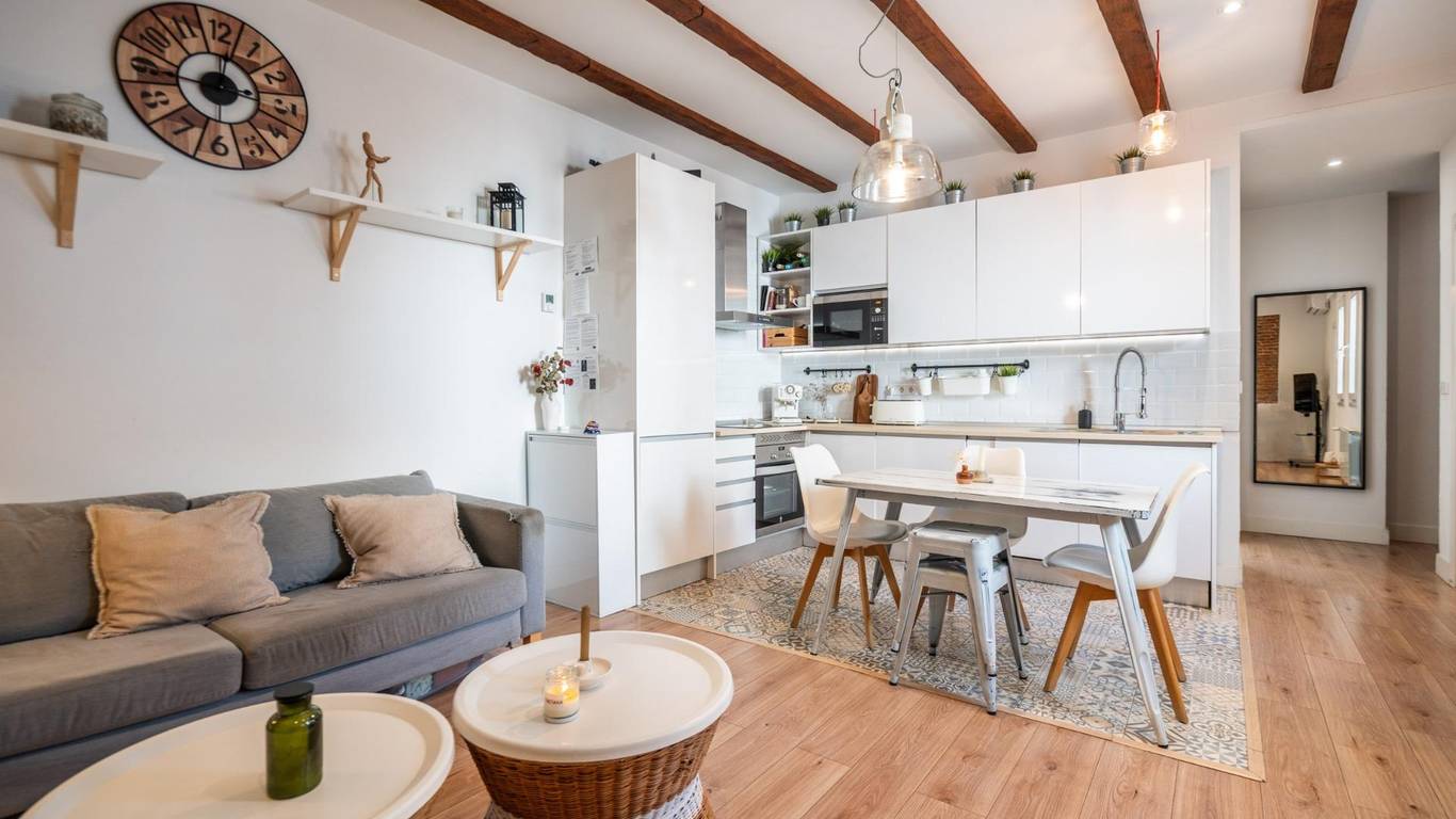 Die Wohnung wurde vollständig renoviert und überzeugt durch einen zeitgenössischen Stil mit viel Persönlichkeit. Hervorzuheben sind die Decken mit sichtbaren Holzbalken, der Kontrast des originalen Backsteins im Wohnzimmer sowie die Ausführungen in neutralen Farbtönen, die Wärme, Ausgewogenheit und eine zeitlose Ästhetik vermitteln.