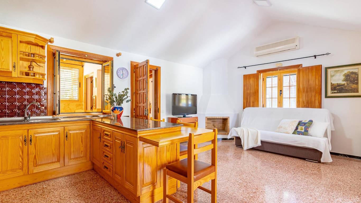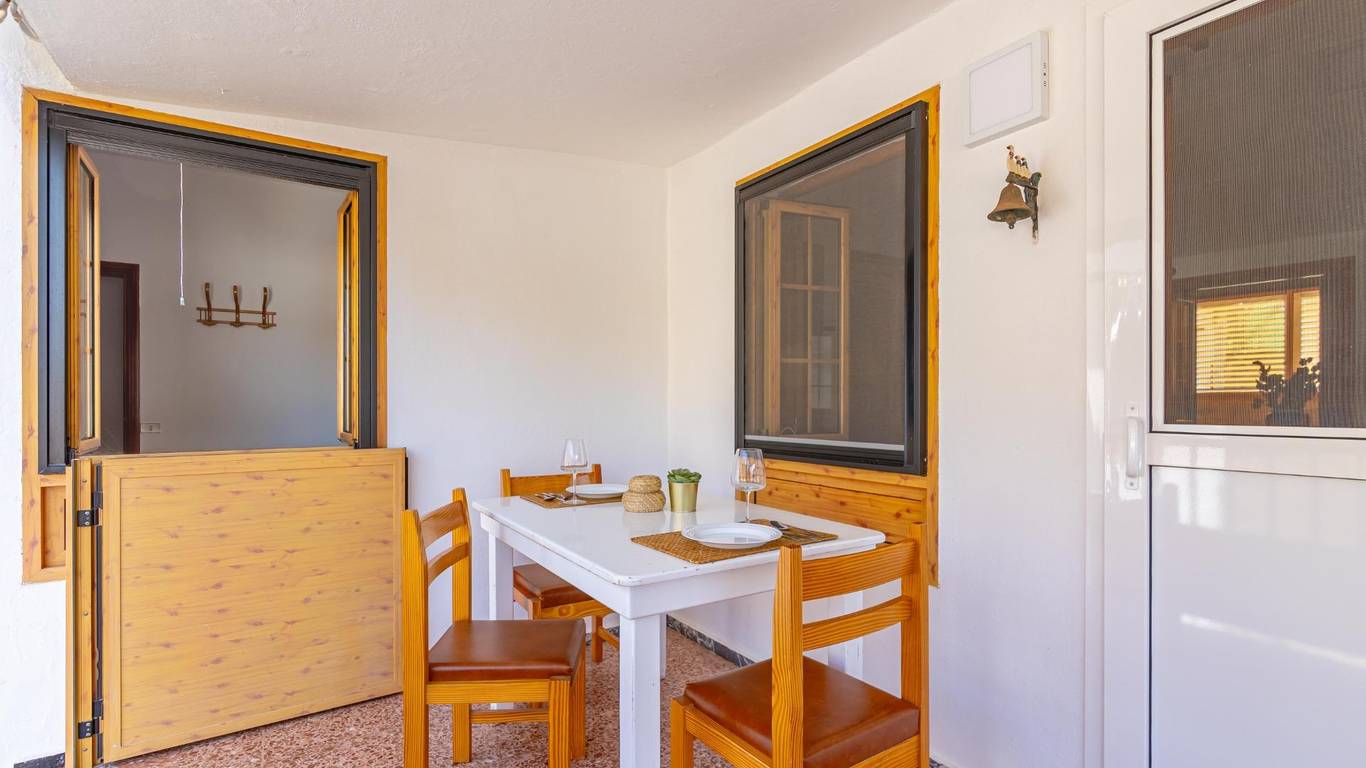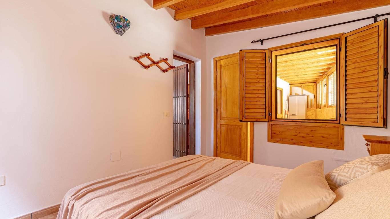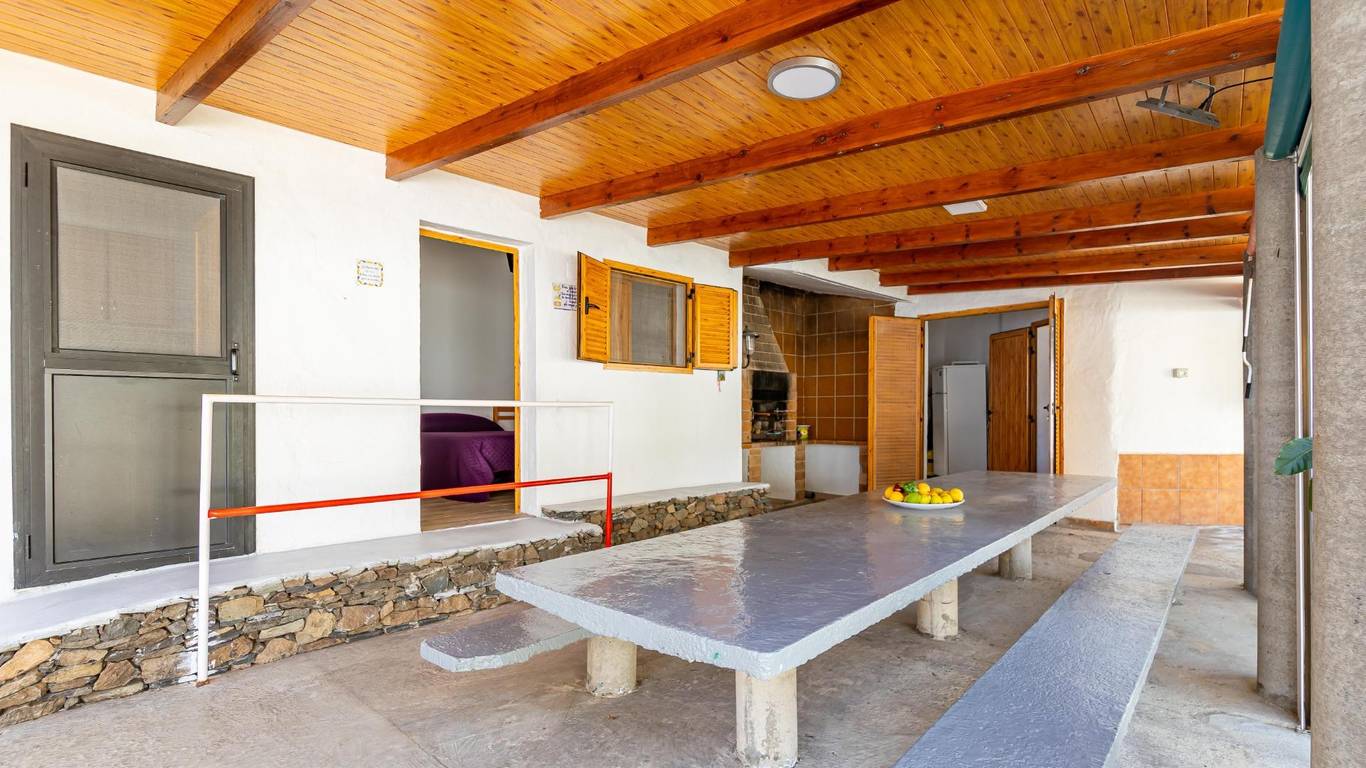 Über eine Außentreppe gelangst du zur Terrasse und in das Wohnhaus. Innen erwartet dich ein heller Wohnbereich mit offener Küche und Essplatz. Es gibt drei Doppelschlafzimmer, ein Einzelzimmer sowie ein Badezimmer mit Dusche. Hinten befindet sich ein überdachter Innenhof ein geschützter Ort zum Entspannen im Schatten.