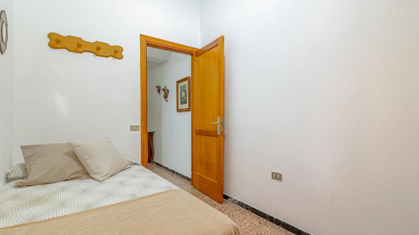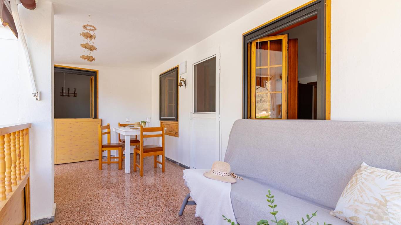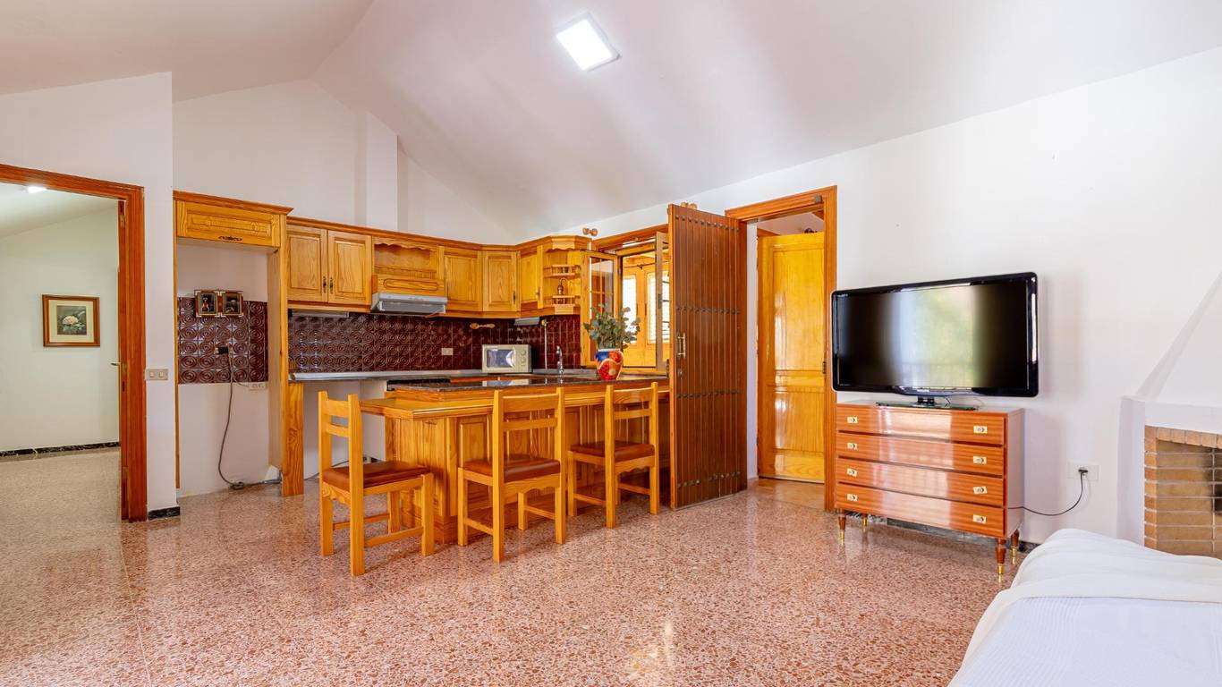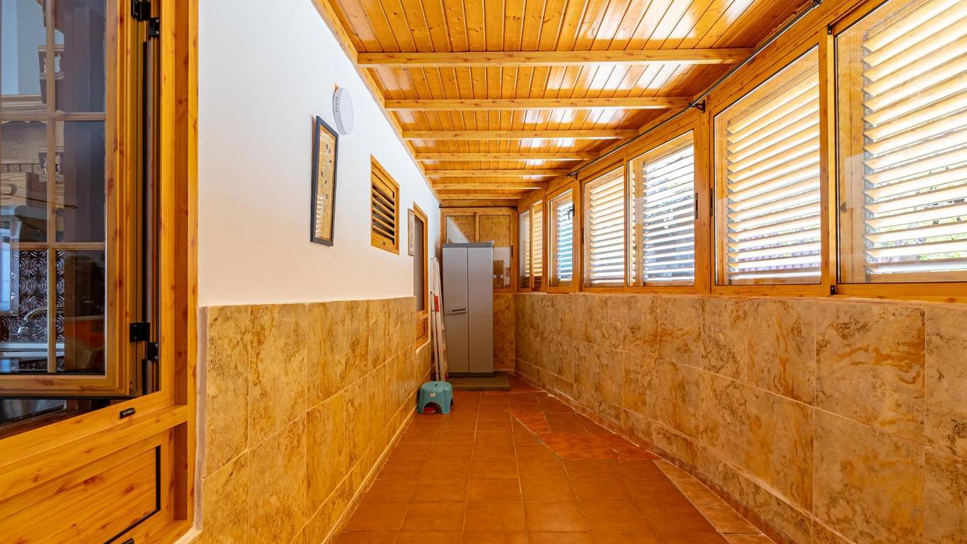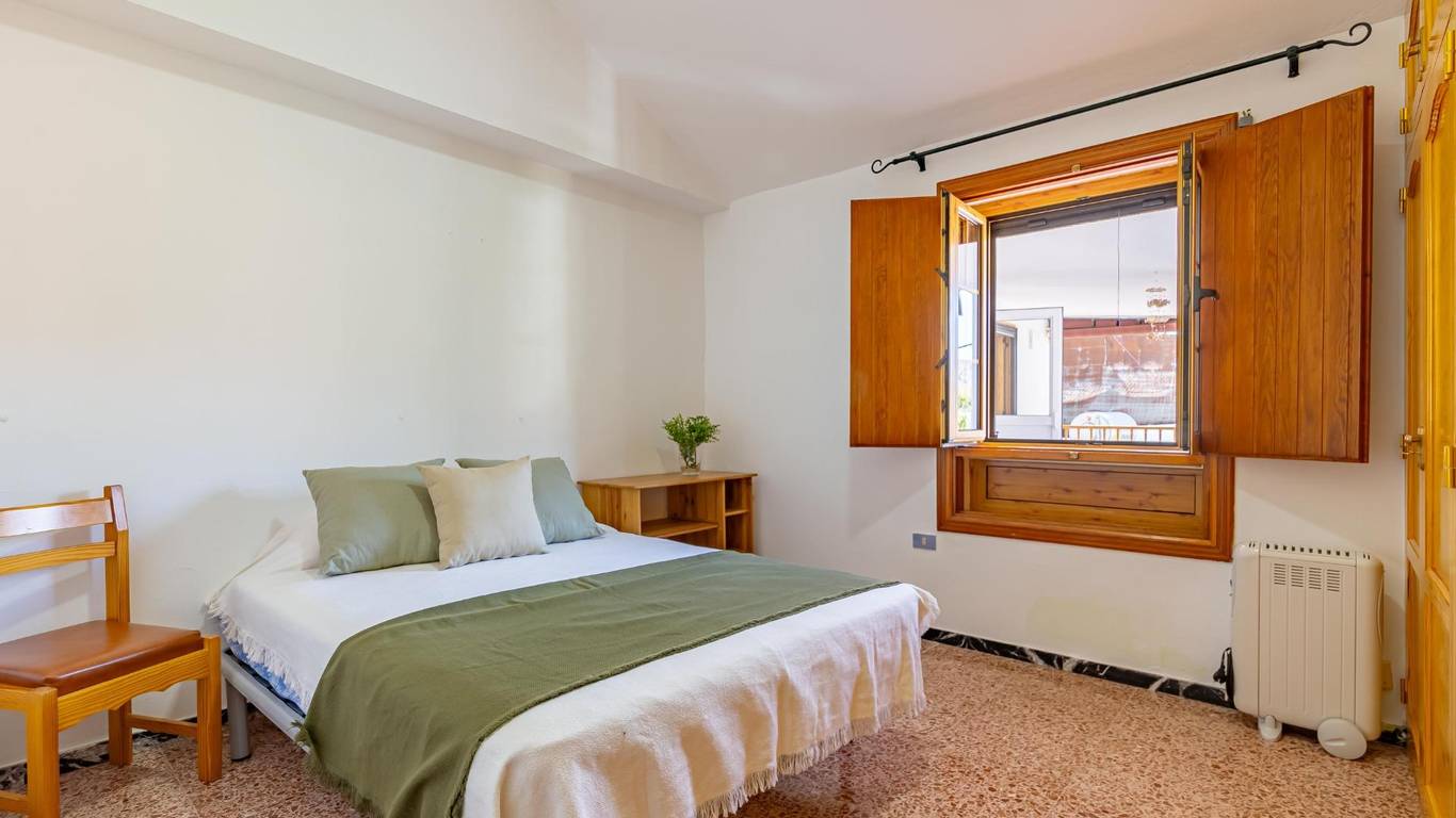 Über eine Außentreppe gelangst du zur Terrasse und in das Wohnhaus. Innen erwartet dich ein heller Wohnbereich mit offener Küche und Essplatz. Es gibt drei Doppelschlafzimmer, ein Einzelzimmer sowie ein Badezimmer mit Dusche. Hinten befindet sich ein überdachter Innenhof ein geschützter Ort zum Entspannen im Schatten.