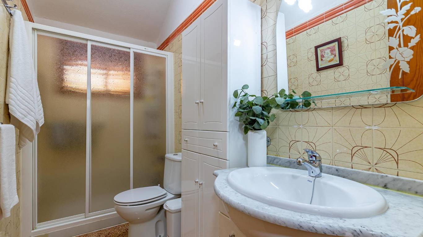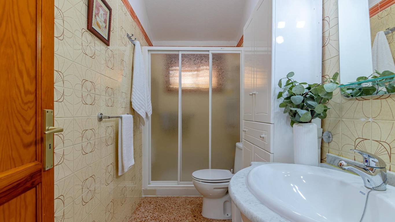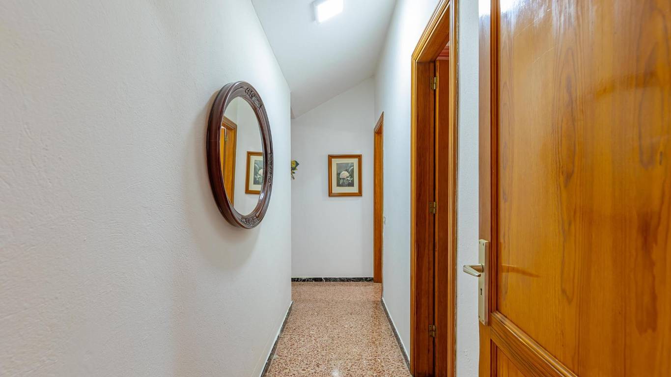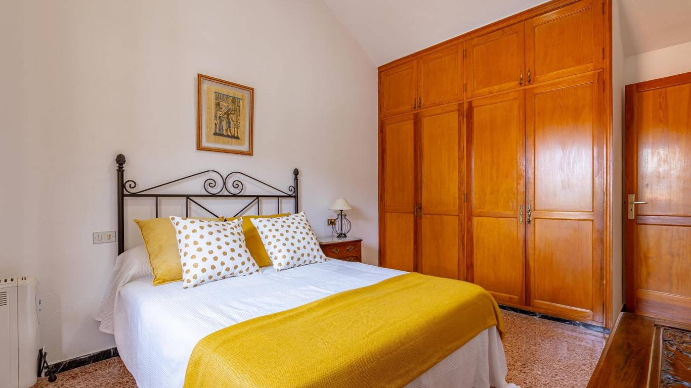 Über eine Außentreppe gelangst du zur Terrasse und in das Wohnhaus. Innen erwartet dich ein heller Wohnbereich mit offener Küche und Essplatz. Es gibt drei Doppelschlafzimmer, ein Einzelzimmer sowie ein Badezimmer mit Dusche. Hinten befindet sich ein überdachter Innenhof ein geschützter Ort zum Entspannen im Schatten.