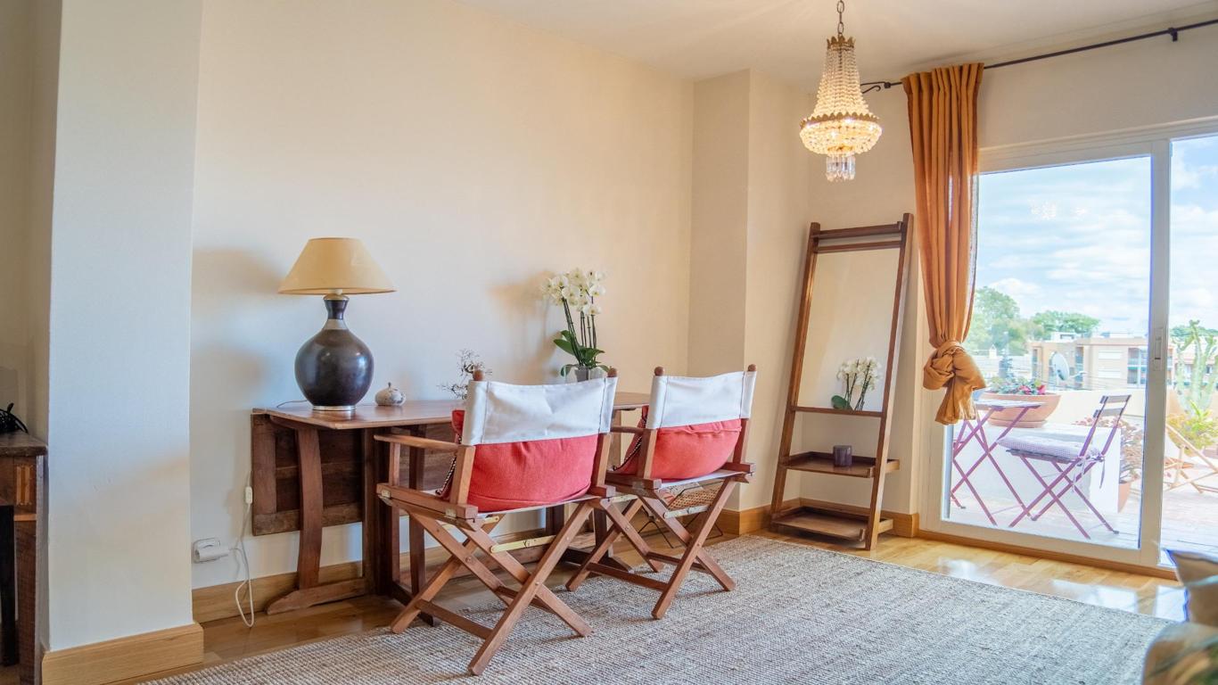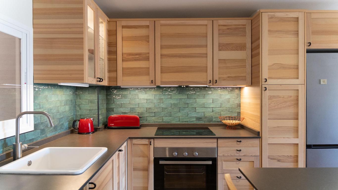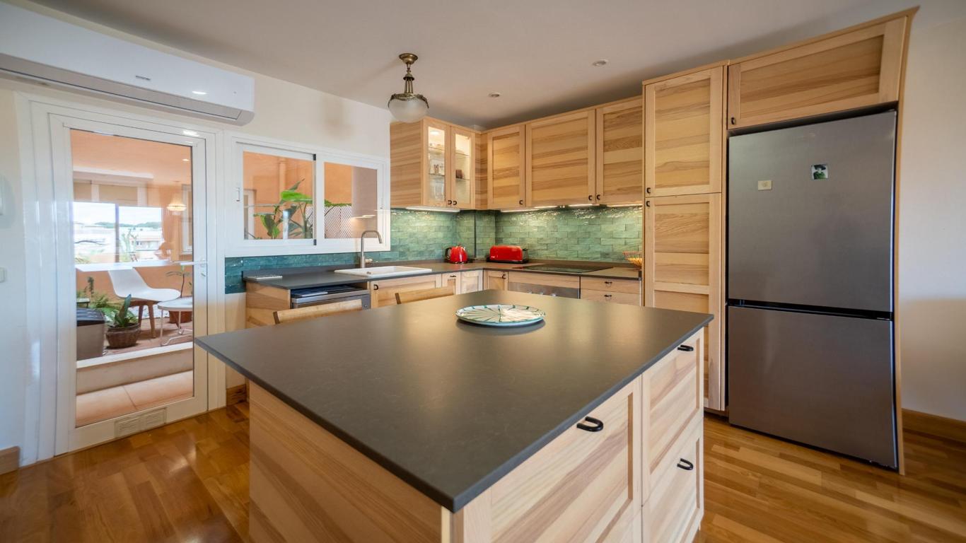A central hallway leads to all rooms: a double bedroom with built-in wardrobe, a full bathroom with contemporary finishes, and a fully furnished and equipped open-plan kitchen that connects to the living room and the terrace. The kitchen stands out for its central island and design that combines noble materials such as wood and handcrafted ceramics.