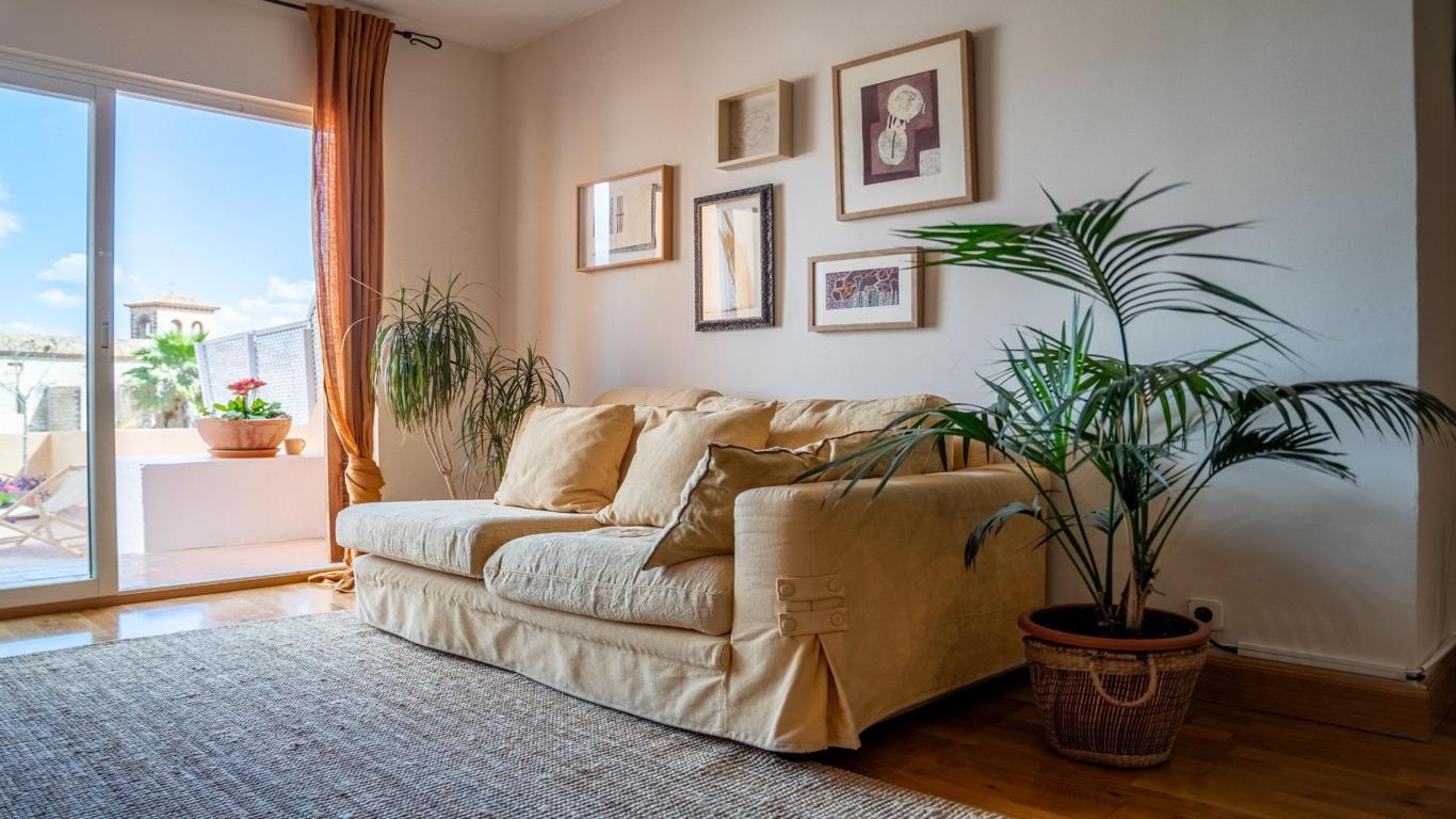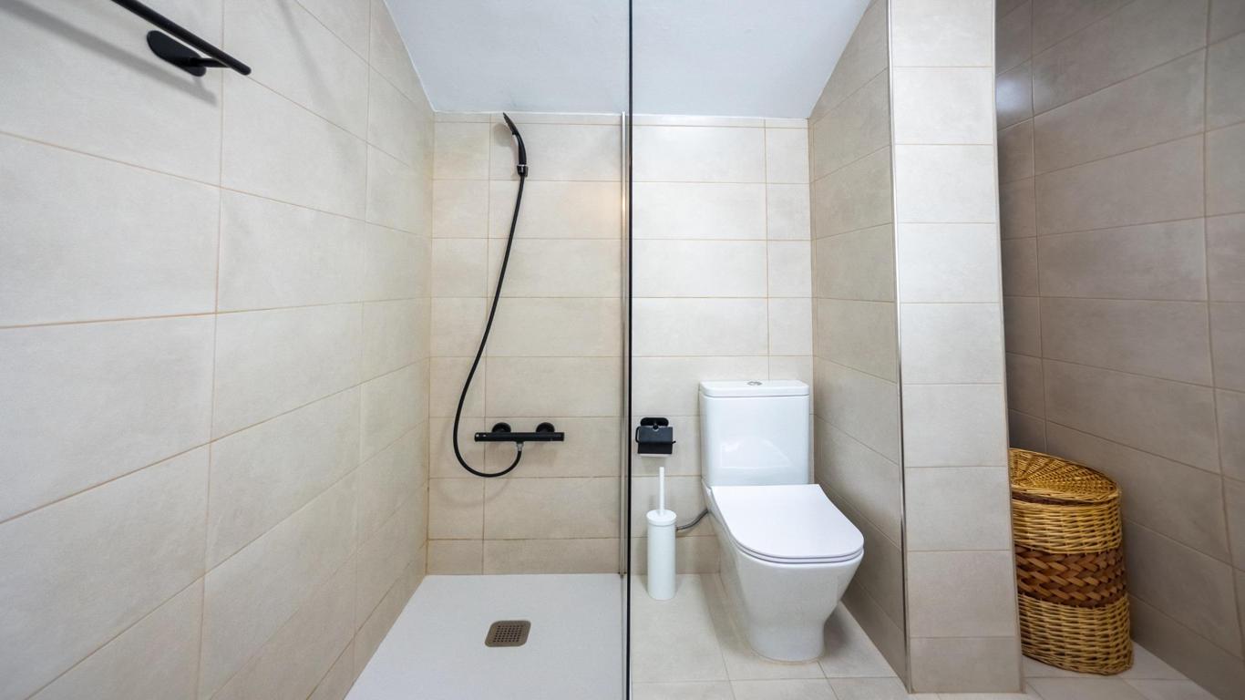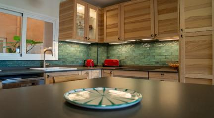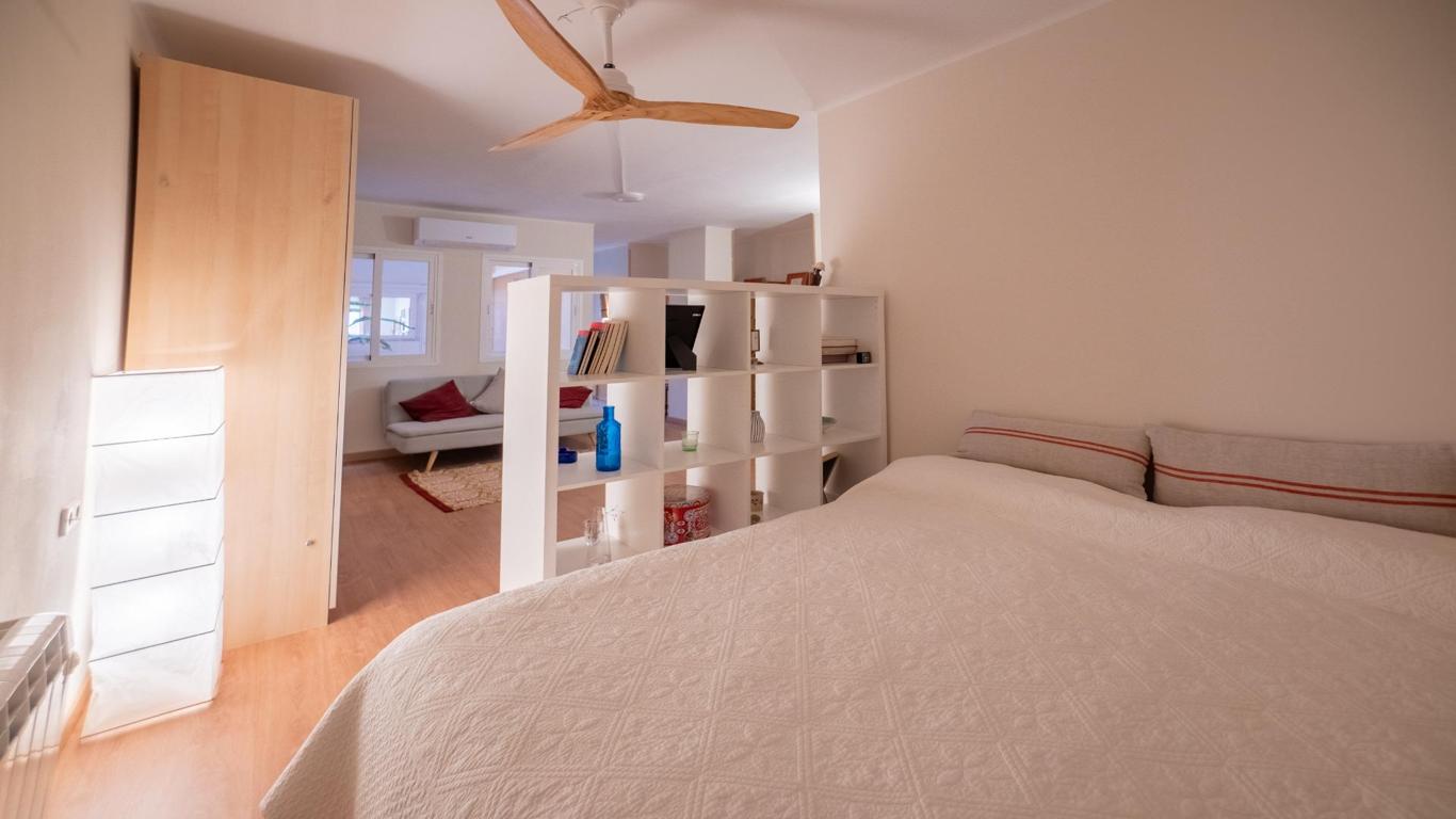 A central hallway leads to all rooms: a double bedroom with built-in wardrobe, a full bathroom with contemporary finishes, and a fully furnished and equipped open-plan kitchen that connects to the living room and the terrace. The kitchen stands out for its central island and design that combines noble materials such as wood and handcrafted ceramics.