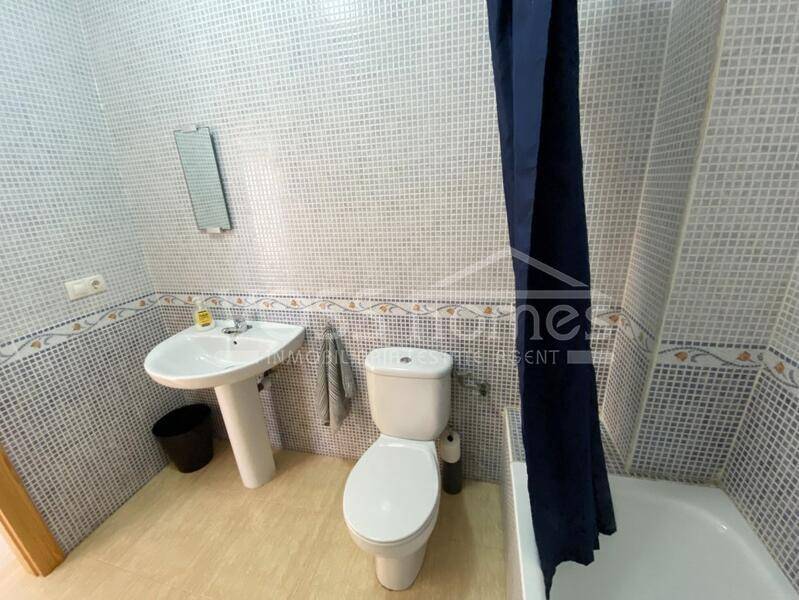 La puerta principal del dúplex es un pequeño pasillo cerrado que conduce a la puerta principal. Primero, un pasillo conduce a un baño con ducha y un dormitorio doble en la planta baja. Este dormitorio cuenta con puertas dobles acristaladas que dan a una pequeña terraza y al jardín y la piscina comunitarios.