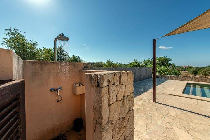 El exterior invita a vivir la finca durante todo el año. Una amplia terraza orientada al suroeste se convierte en el lugar perfecto para disfrutar del sol y de las puestas de sol mallorquinas, mientras la piscina ofrece un espacio ideal para refrescarse durante el verano. La propiedad cuenta además con acceso automático, garaje y un porche cubierto para vehículos.