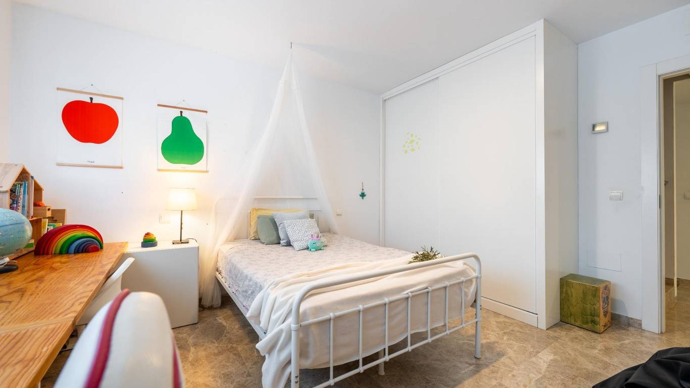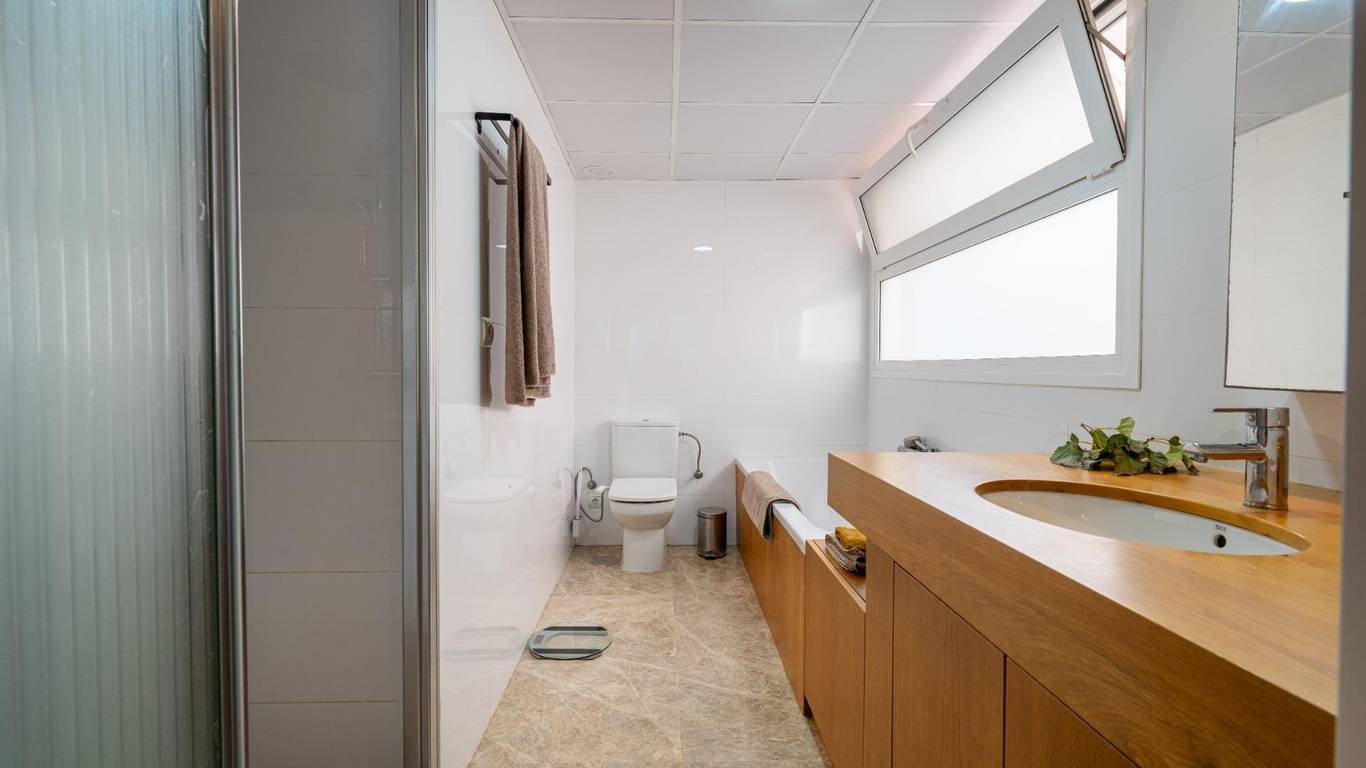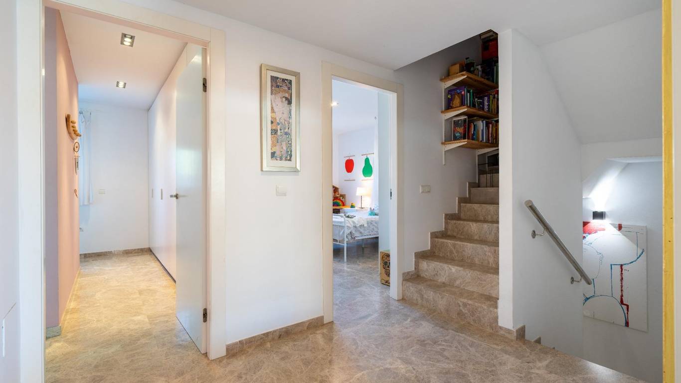 En la planta principal, el dormitorio principal es puro confort: armarios de suelo a techo, baño en suite y un detalle que enamora un conducto directo para la ropa sucia que cae hasta la lavandería del semisótano. Práctico, ingenioso y muy bien pensado.
