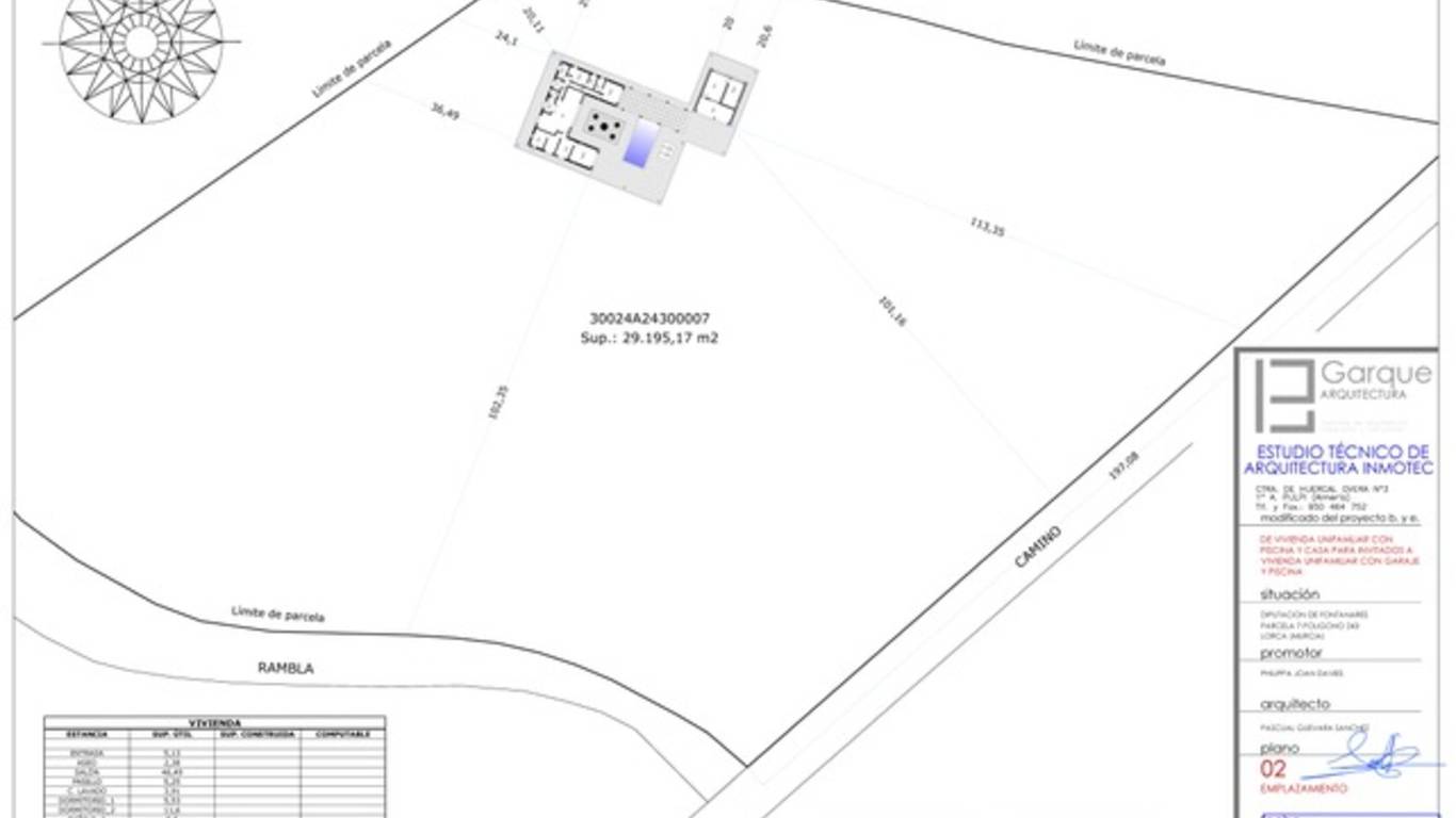 Parcela rústica con proyecto de obra y licencia de obra vigente del Ayuntamiento de Lorca para construir una vivienda de una sola planta de 194 m², con 4 dormitorios y 4 baños, piscina privada desbordante (10x5 m²), cocina exterior independiente (22 m²) y una edificación anexa (40 m²), además de una cochera independiente de madera con espacio para 2 coches. Todo ello en una parcela de poco menos de 30.000 m² con numerosos almendros.