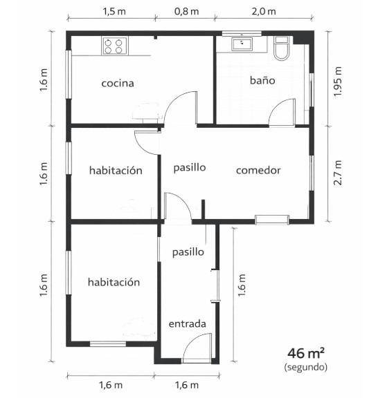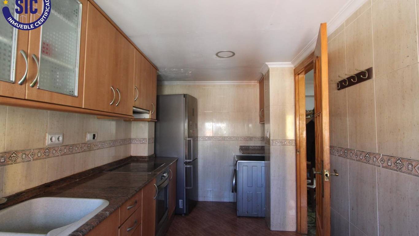 Distribución funcional con una habitación doble, una habitación individual, amplia cocina, salón-comedor y baño completo.