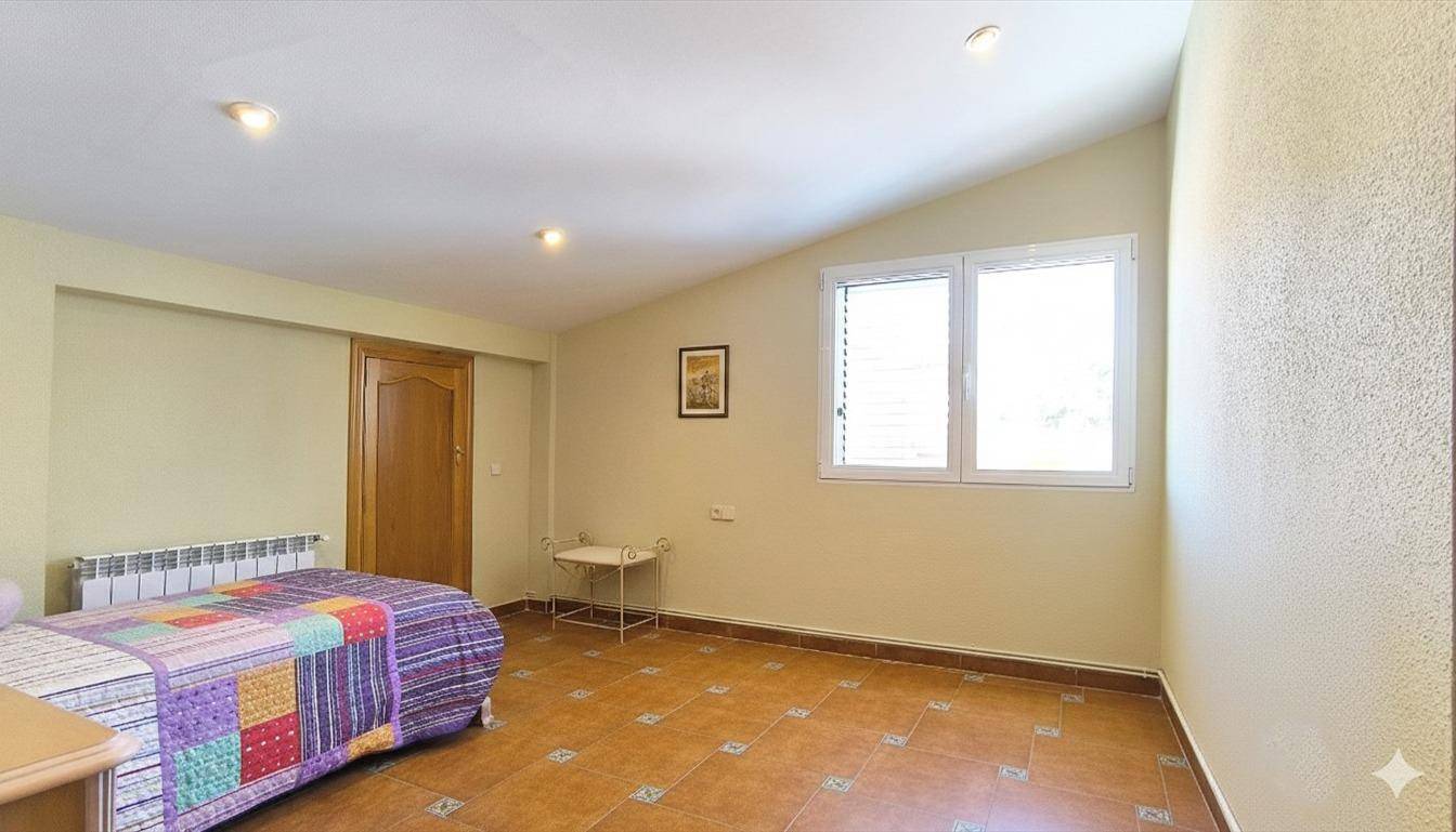 -La PLANTA ALTA, tipo buhardilla, está comunicada por la escalera interior con la planta principal. En ella una amplia sala central y otros tres dormitorios dobles, un amplio cuarto de baño completo con bañera, ducha y espacio para lavandería. La casa es tan amplia que permite la convivencia de dos familias cada una con sus espacios independizados.