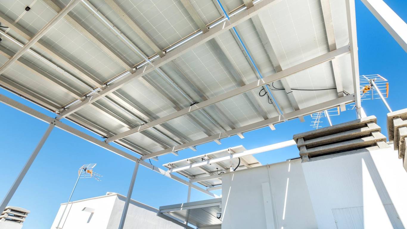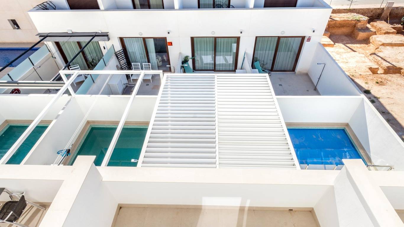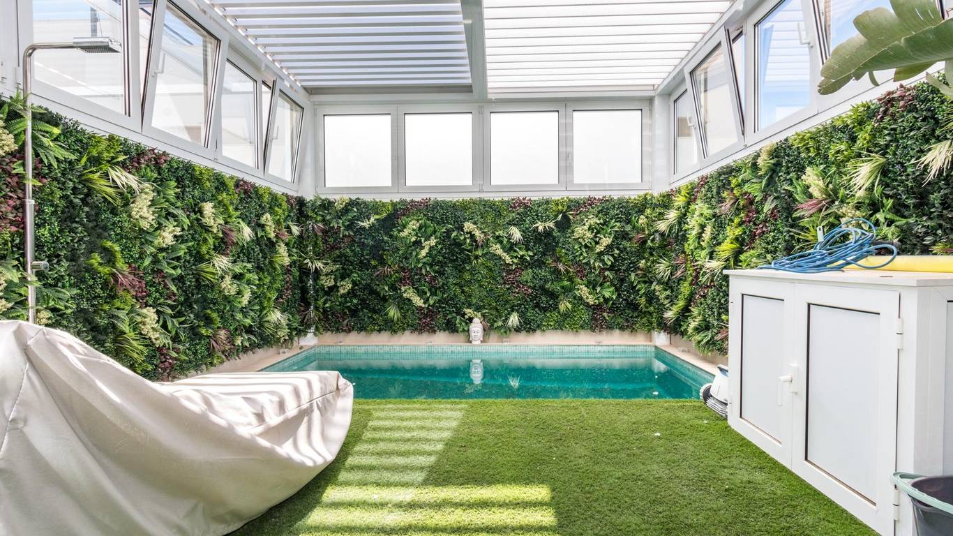 Jardín trasero orientado al sureste con pérgola bioclimática, piscina privada y una zona muy cuidada alrededor. Arriba, el solárium se ha aprovechado bien: placas solares que hacen de techado y una cocina exterior que da bastante juego.