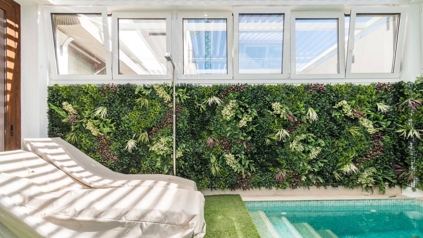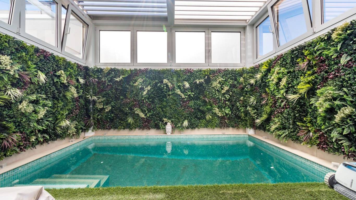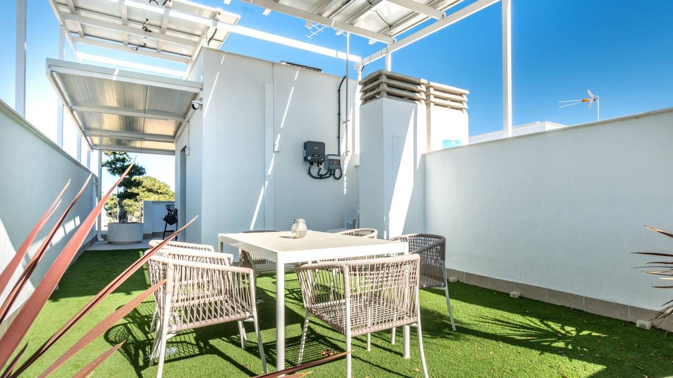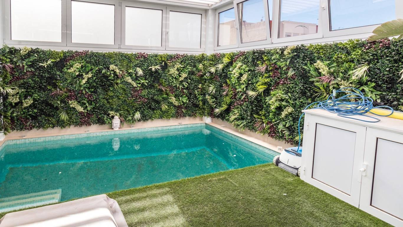 Jardín trasero orientado al sureste con pérgola bioclimática, piscina privada y una zona muy cuidada alrededor. Arriba, el solárium se ha aprovechado bien: placas solares que hacen de techado y una cocina exterior que da bastante juego.