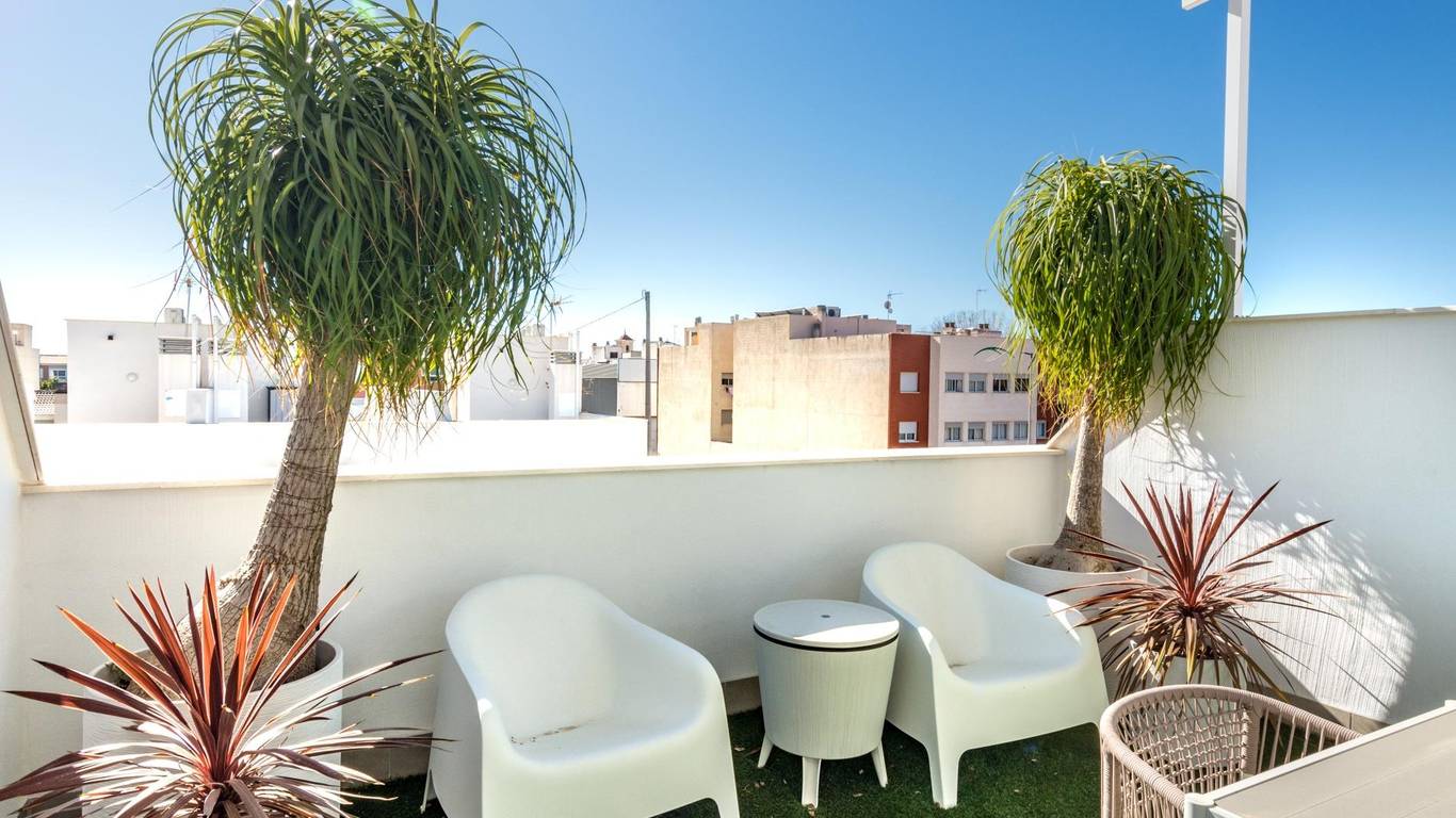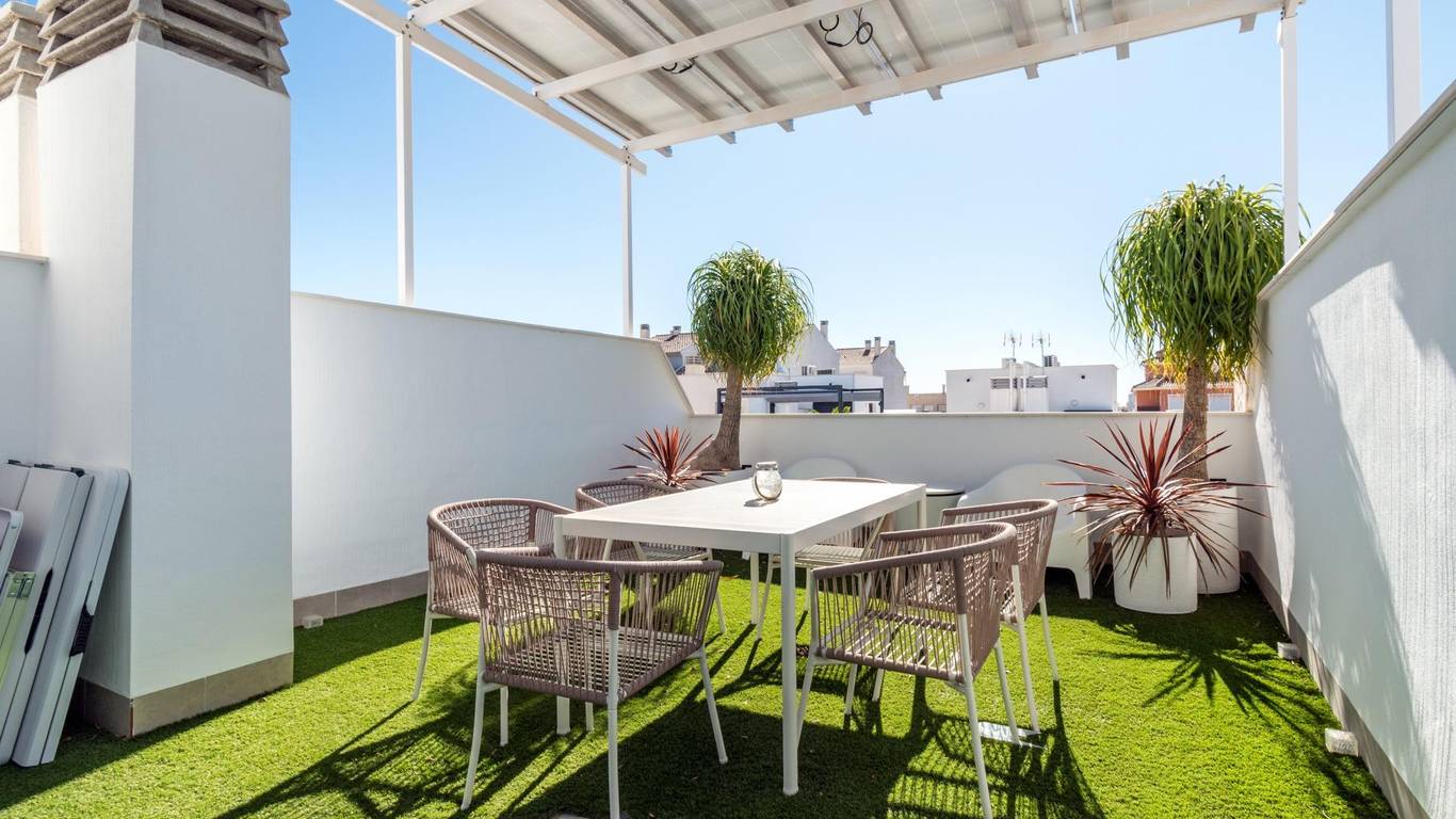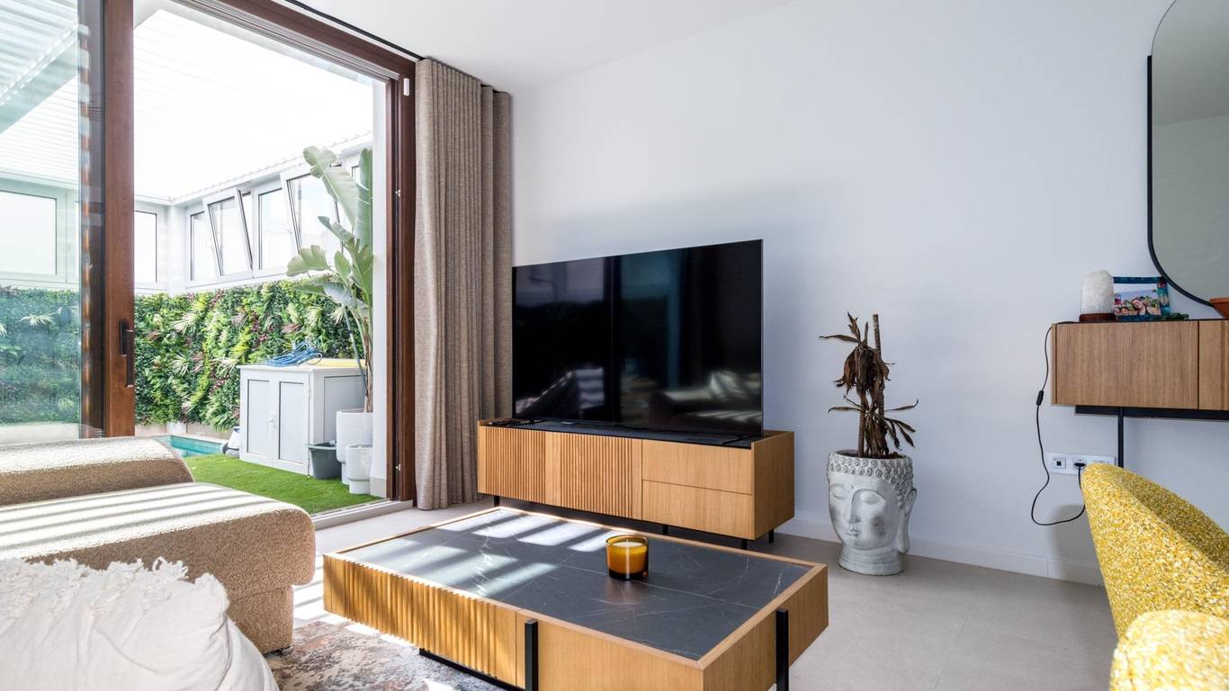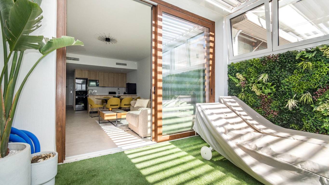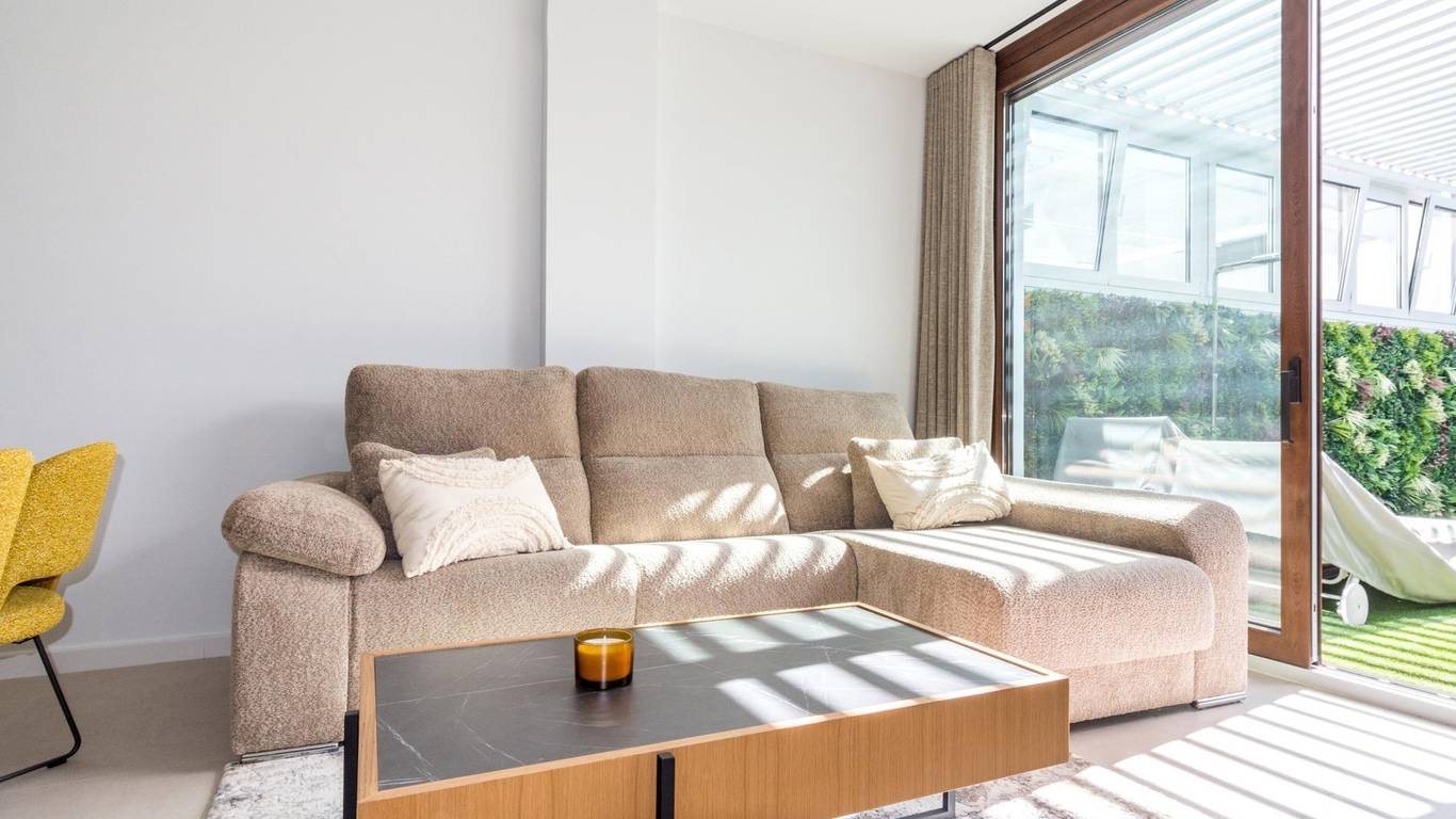Salón amplio con cocina integrada, tres dormitorios dobles (uno con terraza propia) y dos baños completos. Todo bastante equilibrado, sin espacios desaprovechados. La parte exterior es lo que marca la diferencia.