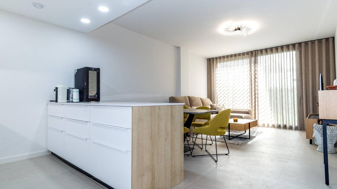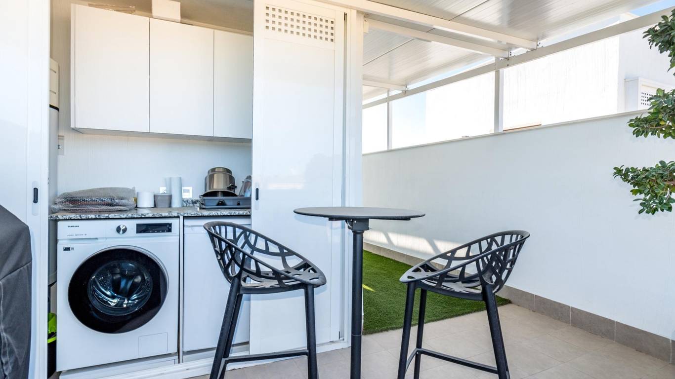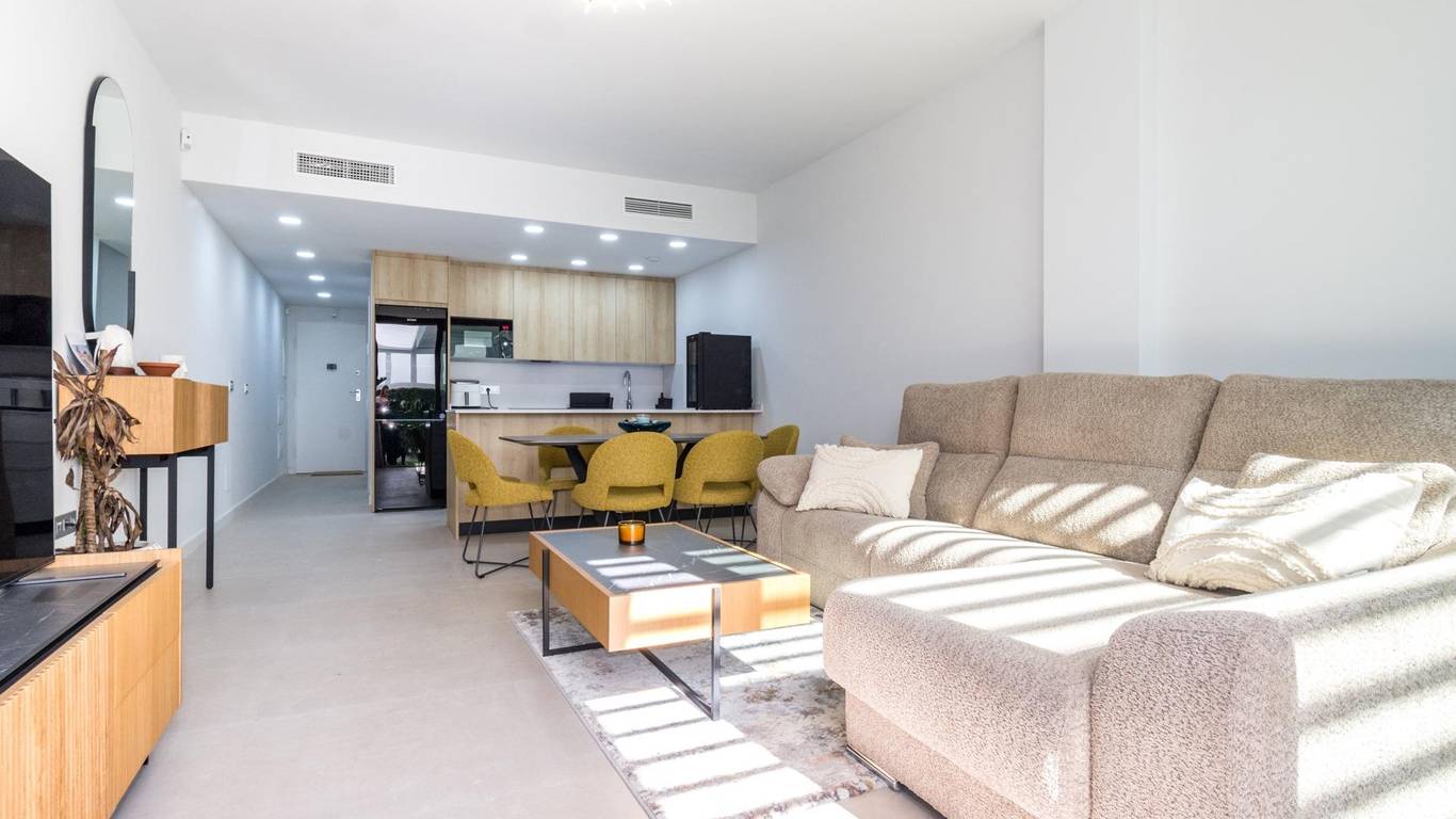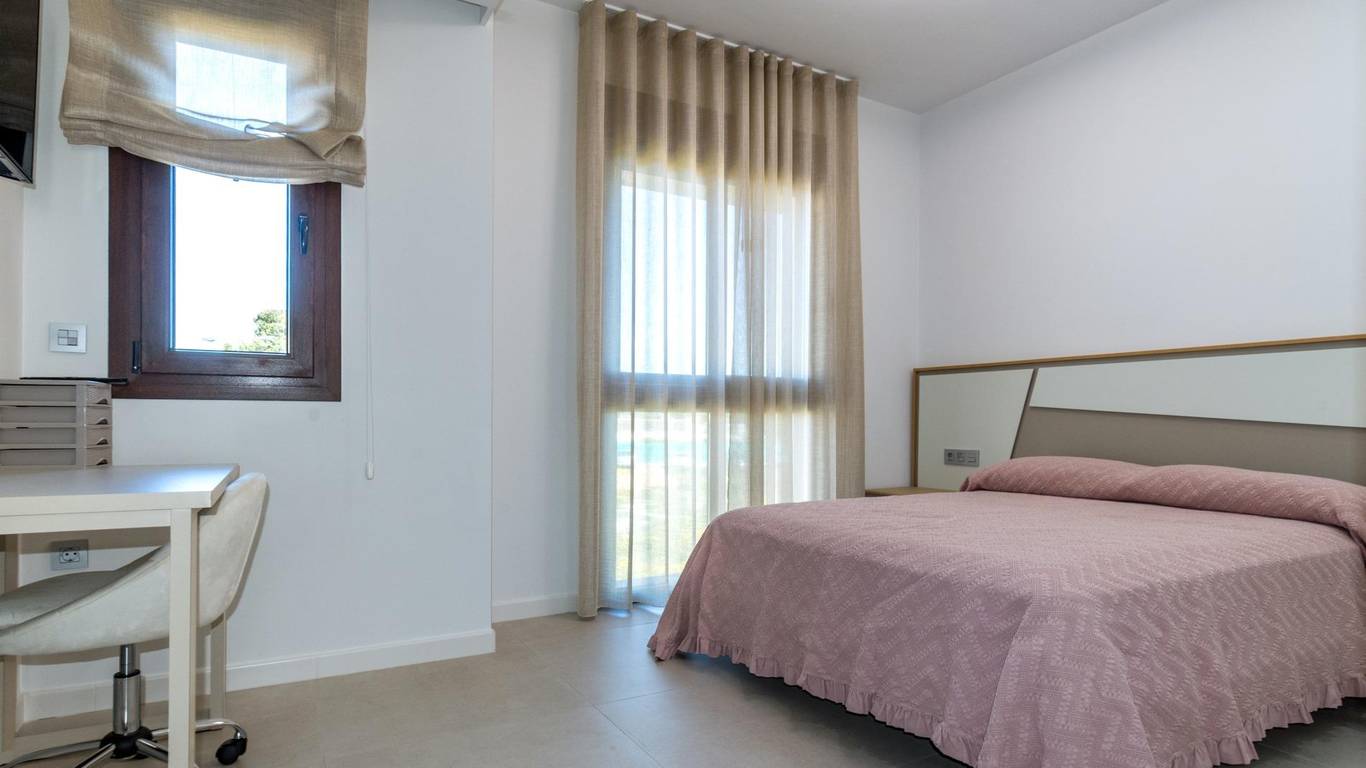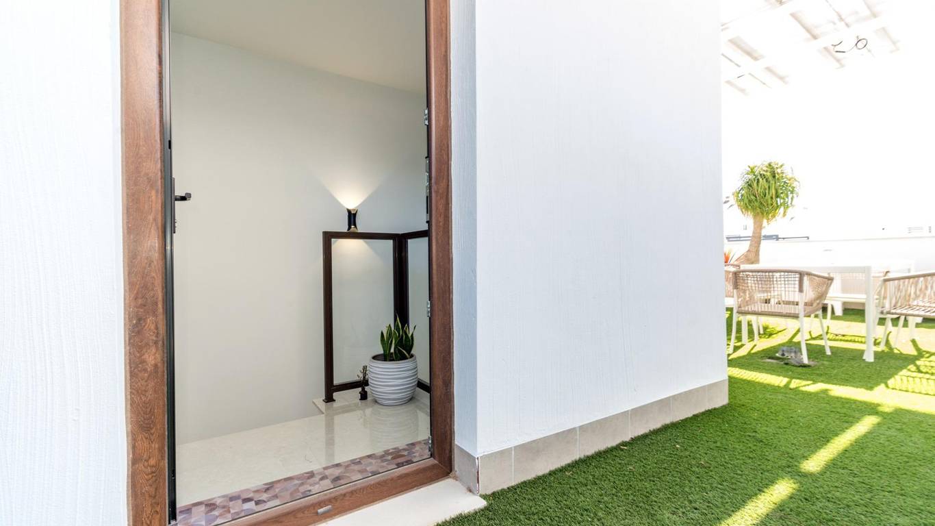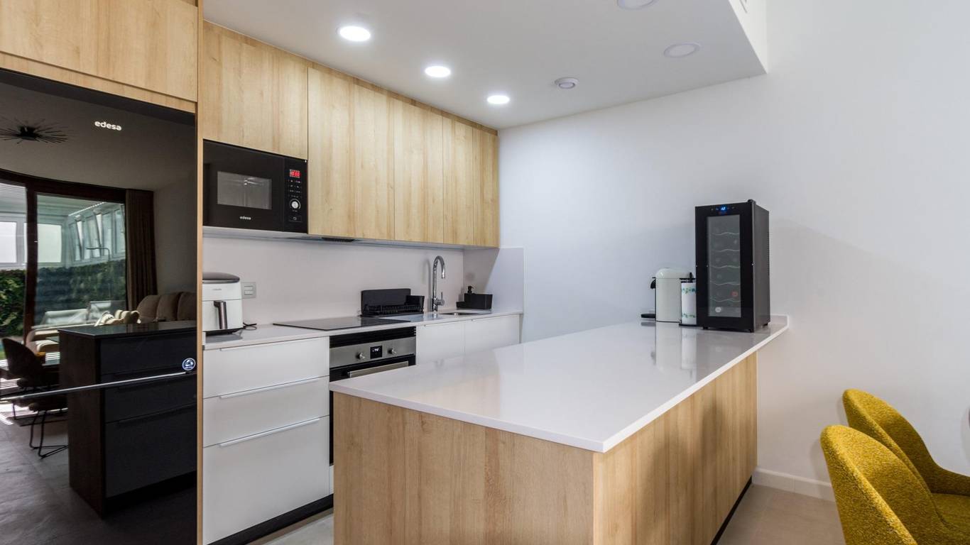 Salón amplio con cocina integrada, tres dormitorios dobles (uno con terraza propia) y dos baños completos. Todo bastante equilibrado, sin espacios desaprovechados. La parte exterior es lo que marca la diferencia.