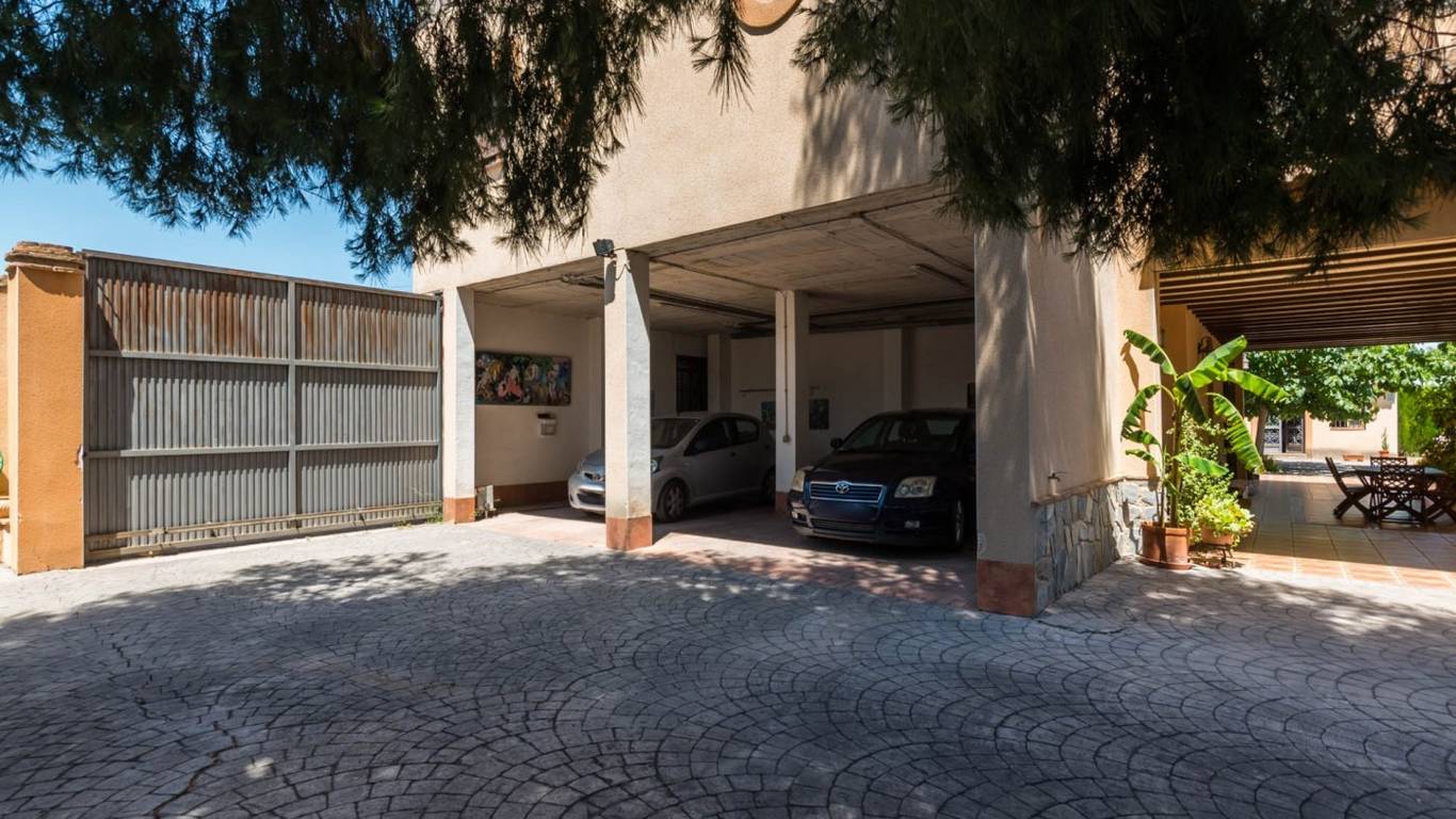 ENTRADA A LA PARCELA: Entrada para vehículos con puerta corredera automática y zona para aparcamiento techada, amplio patio donde se ubica una barbacoa con fogón y fregador antiguo, horno moruno estupendamente conservado, antiguas cuadras restauradas donde hay un almacén ( cuarto de aperos ) y sala de máquinas.