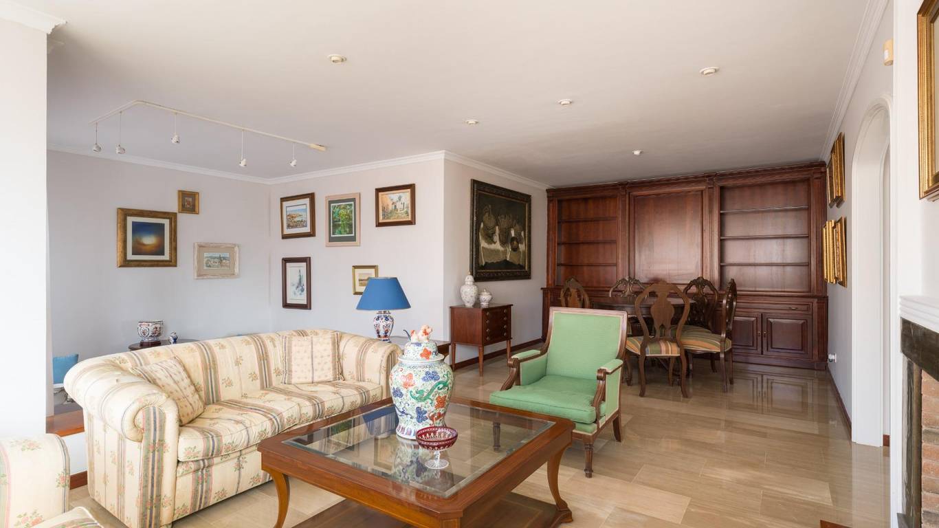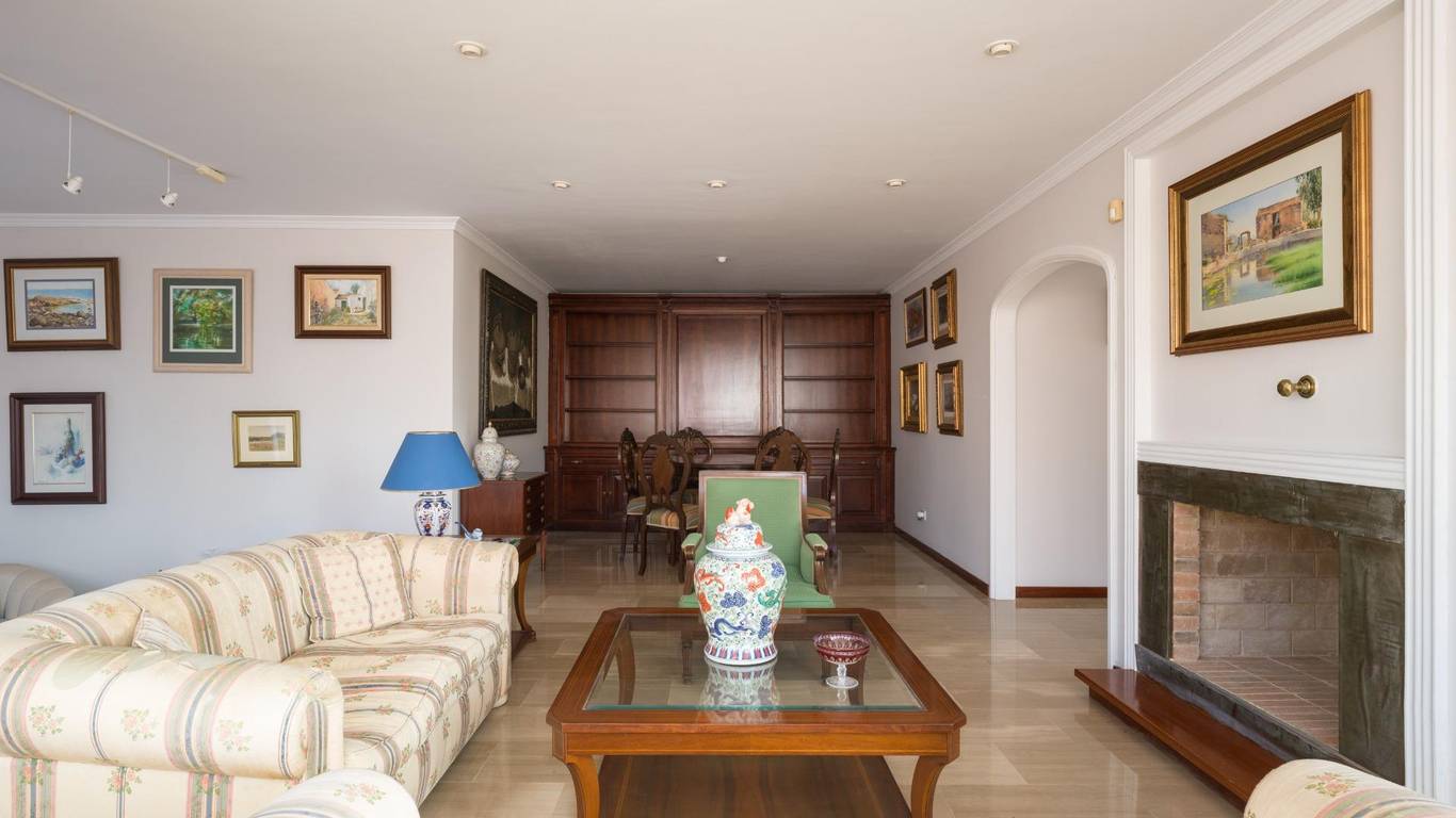 The living room on the right wing, bright and welcoming, has direct access to the terrace and a balustrade overlooking the garden.