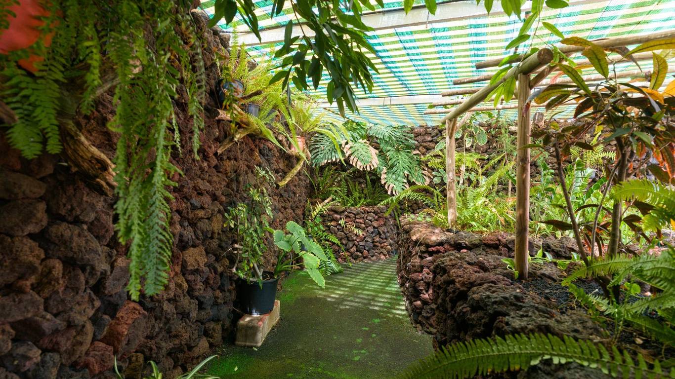 The garden surrounds the entire property and includes a greenhouse area with ferns and tropical plants, as well as a private pool with solarium and barbecue area, and a full outdoor bathroom.