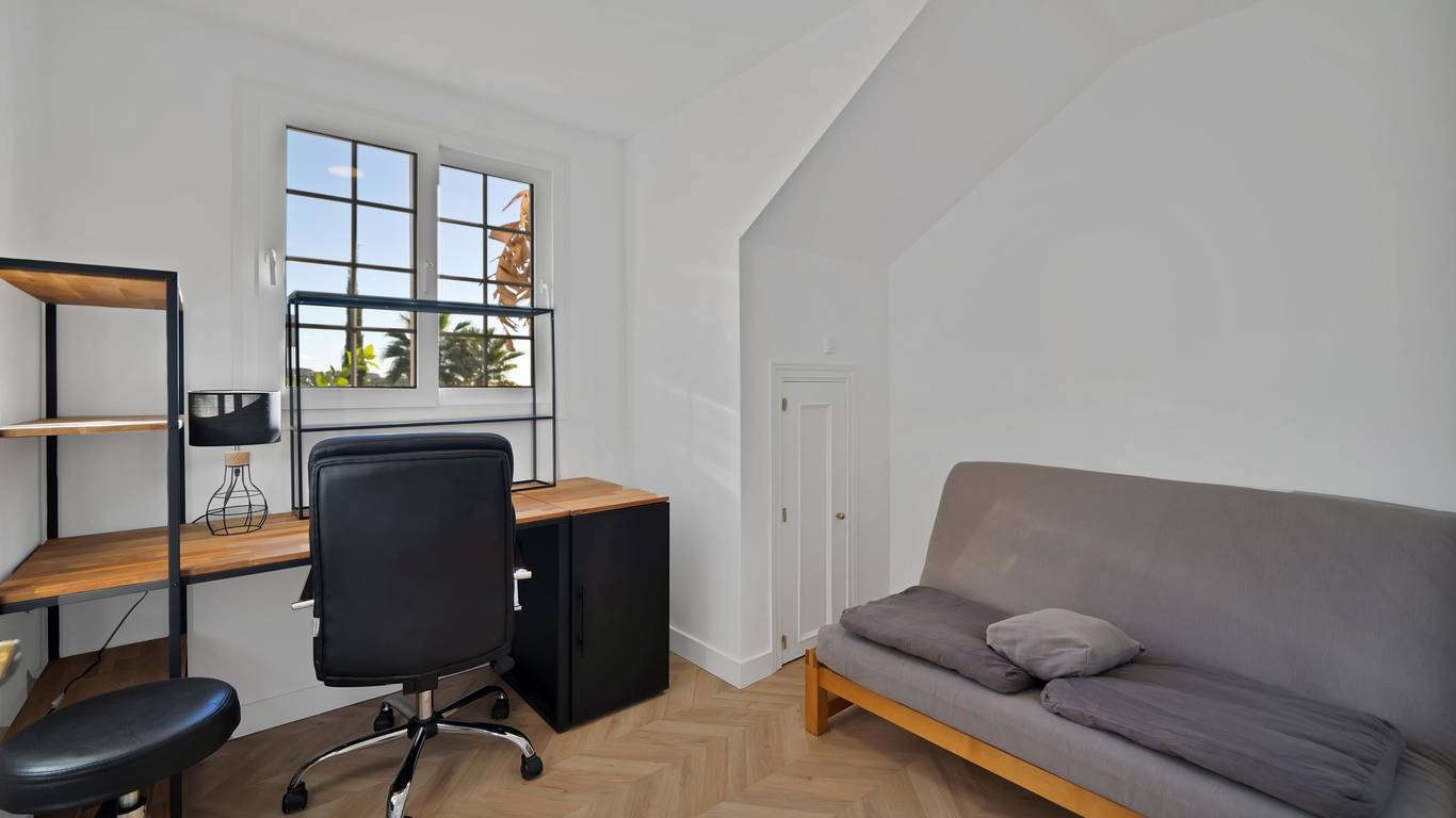 Нижний уровень включает в себя еще три спальни и две ванные комнаты, одна из которых с ванной комнатой и гардеробной. Кроме того, здесь находится большой коридор с уютным уголком для чтения, подсобное и кладовое помещение, а также небольшая комната, в настоящее время оборудованная как домашний офис с диваном-кроватью.