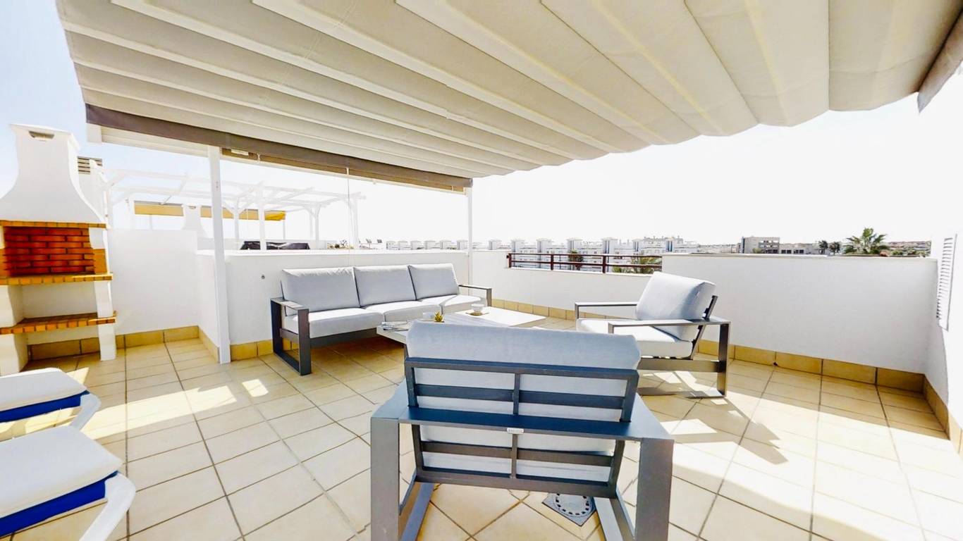 Вот все, что вам нужно знать об этом объекте: 2 светлые спальни с двуспальными кроватями, 1 ванная комната, просторная гостиная-столовая с выходом на большую террасу, кухня открытой планировки и подсобное помещение с прачечной, потрясающий частный солярий на крыше с панорамным видом на море, навес для создания затененной зоны отдыха, частное парковочное место, общий бассейн, тихая улица без движения транспорта.