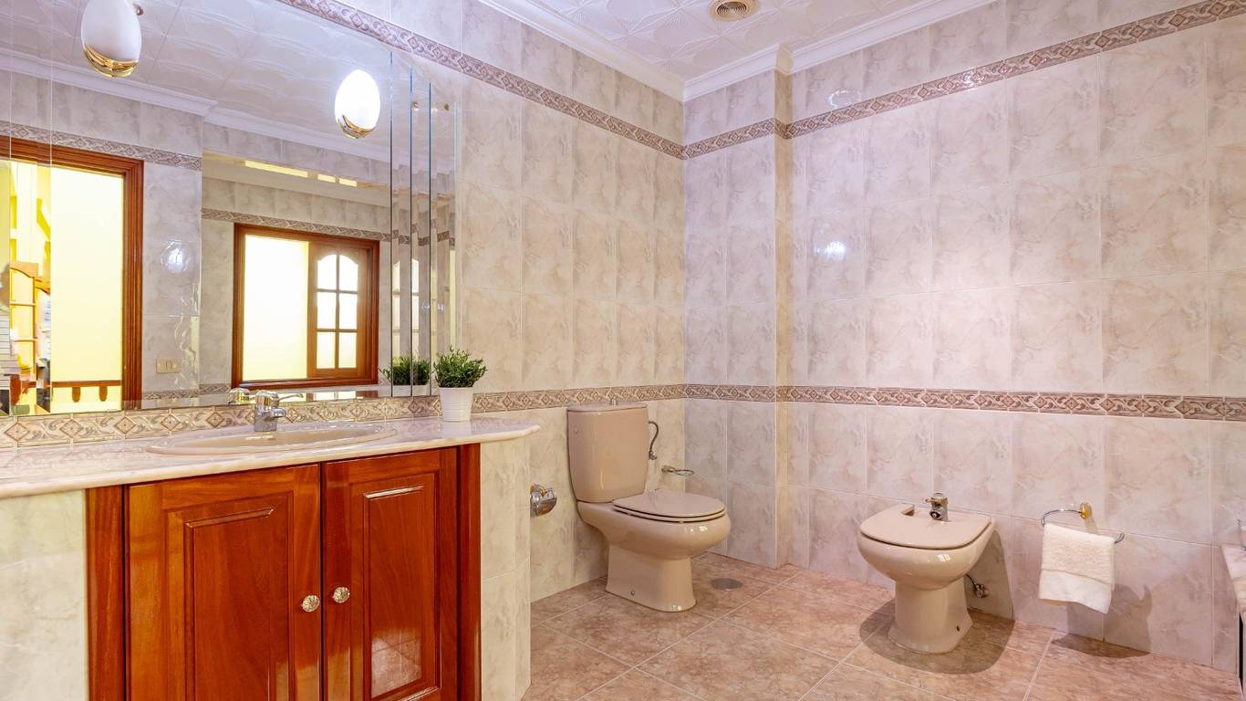 En esta planta encontramos también un dormitorio, perfecto como habitación de invitados o despacho, un baño completo con bañera y un balcón exterior que aporta ventilación y luz natural. Una elegante escalera interior de granito natural conecta con la planta superior.