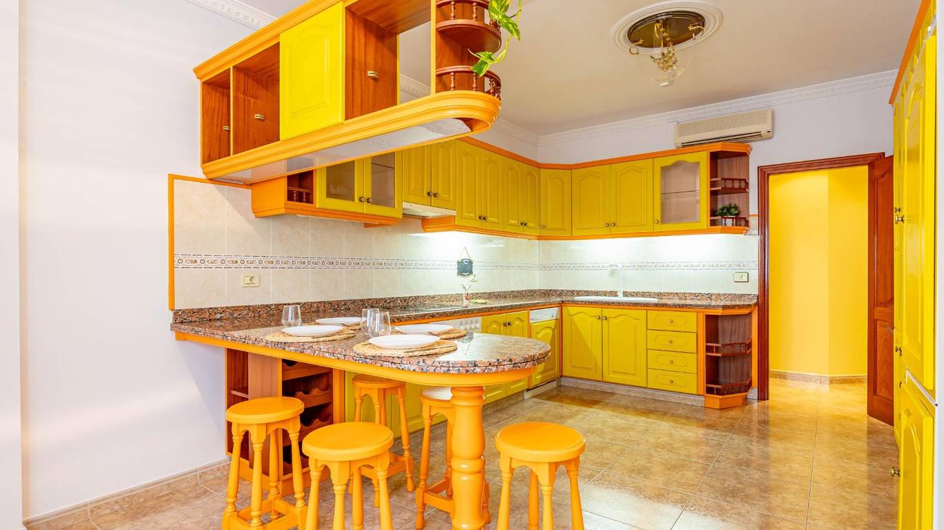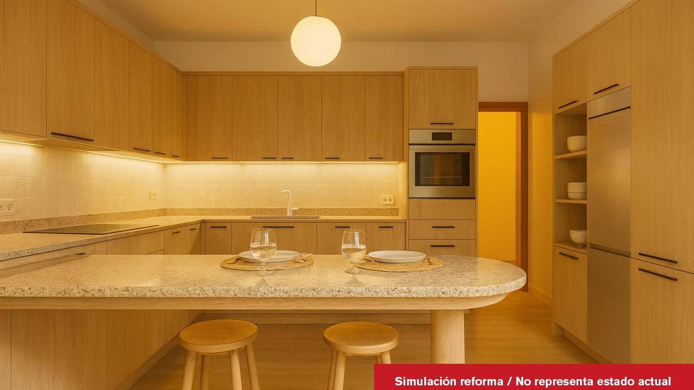 La cocina independiente, con muebles de sapeli y encimera de granito, combina funcionalidad y amplitud, convirtiéndose en el corazón del hogar.