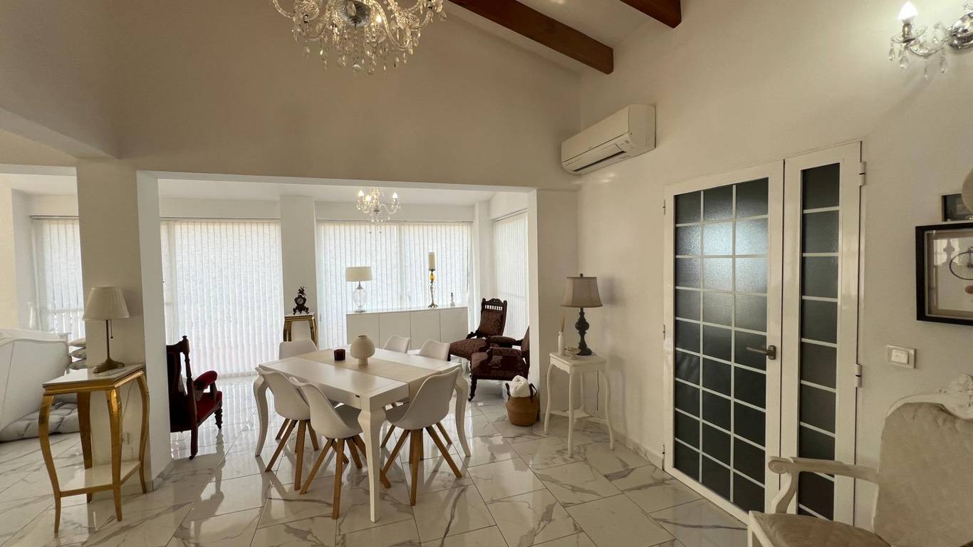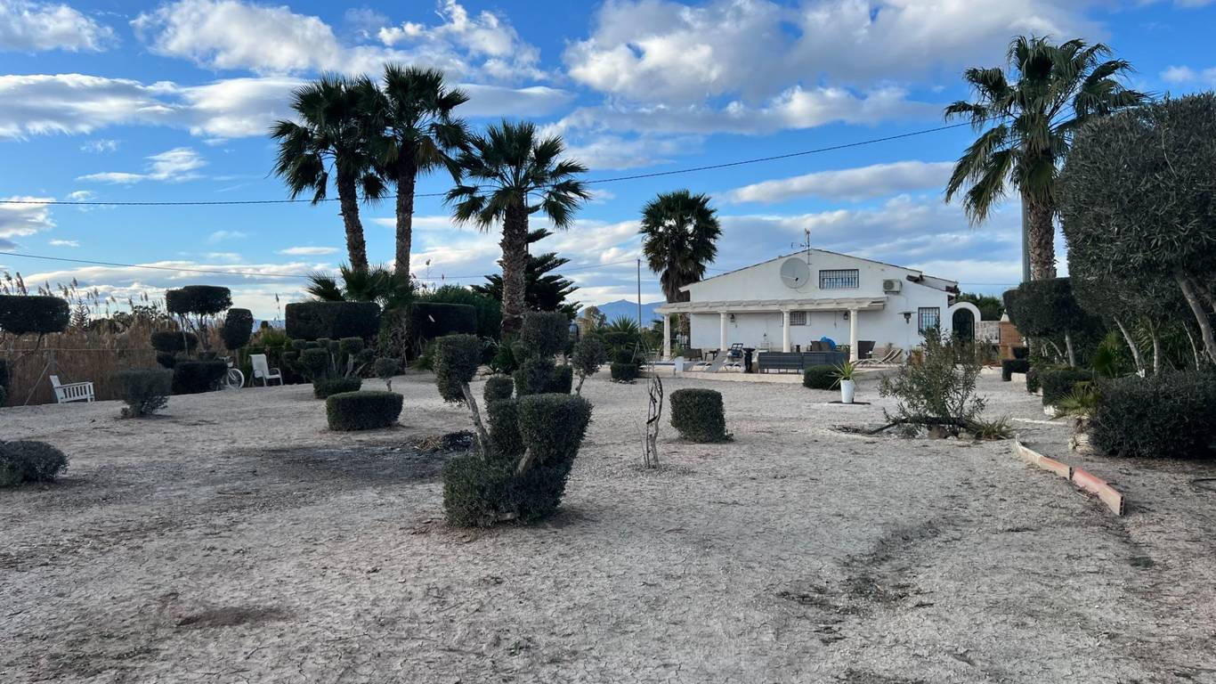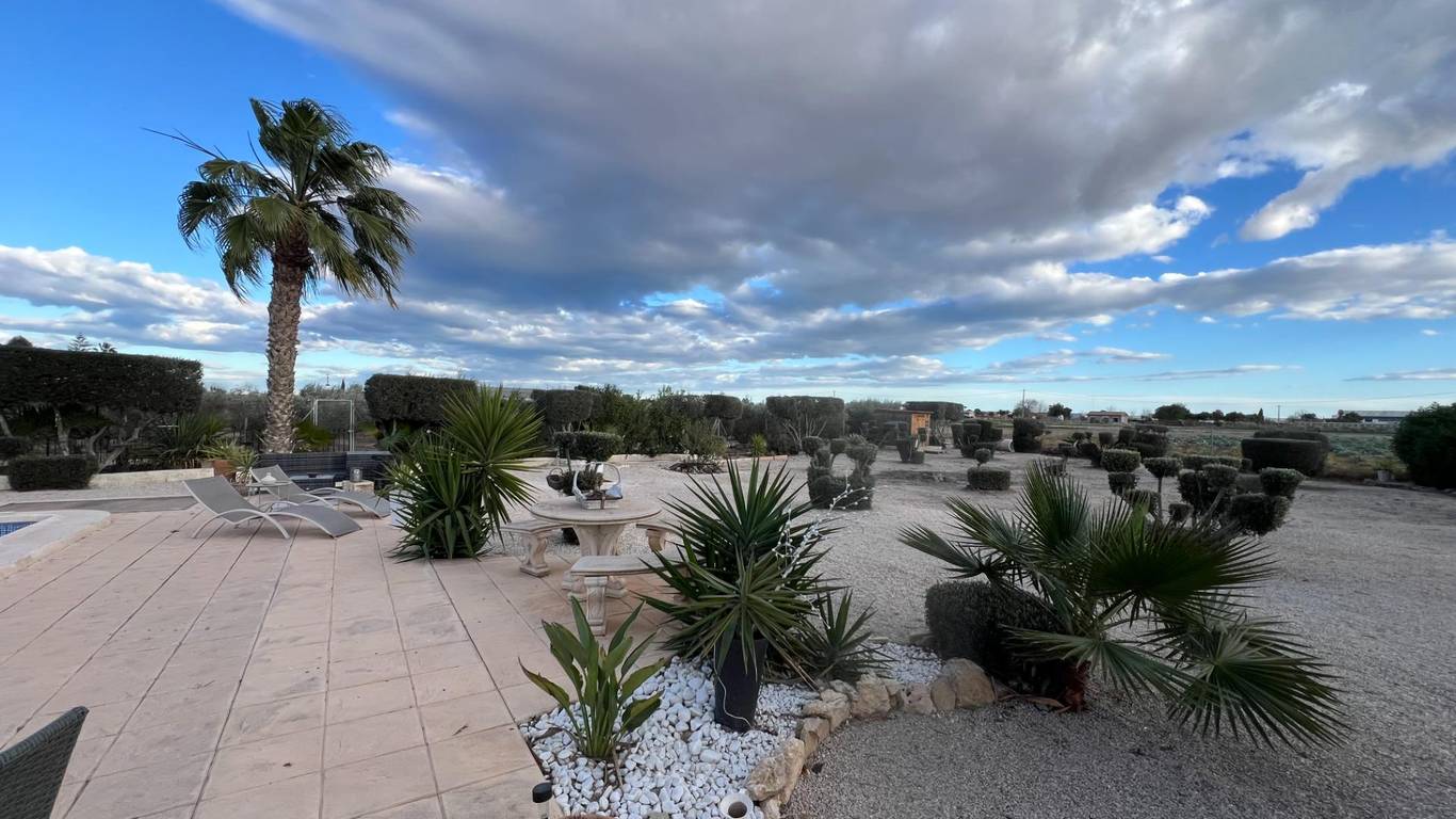 Discover the perfect blend of rural charm and modern living in this impressive detached property located in the countryside of Dolores. The property benefits from a secluded, gated location, including a luxurious private swimming pool and outdoor barbeque area. Five beautiful marble steps lead to the impressive entrance, with a high security front door. Once inside there is a welcoming hall with security lighting and a fitted mirror fronted wardrobe, providing excellent storage. There are 3 generously sized bedrooms: Two double and one mezzanine style single. All bedrooms have ample wardrobe and storage space. Additionally each boasts its own unique and beautifully styled and furnished en suite bathroom. There is an additional fourth family shower room for further comfort. The wonderfully spacious open plan living area has a spectacular lounge and dining area, with outstanding natural lighting and views to the stunning gardens and surrounding countryside. There is a wood burning stove for the winter months. The kitchen is fully equipped with a range of base and wall units and marble surfaces. The island integrates an electric oven and there is a gas and electric hob. A large American style fridge freezer and washing machine complement the space. The exterior of the property is just as impressive with its large and charming mature gardens of palm and olive trees in addition to tastefully placed floral bushes to enhance the privacy. There is a large terraced area leading from the lounge dining area and 2 further balconies. Once outdoors the spacious outdoor dining patio complements the barbecue area, with a further tiled courtyard. The property has air conditioning heating units in the living area and bedrooms.